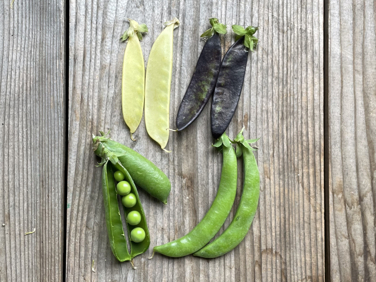 黄色と紫のキヌサヤは、炒めものやサッと茹でてサラダなど。