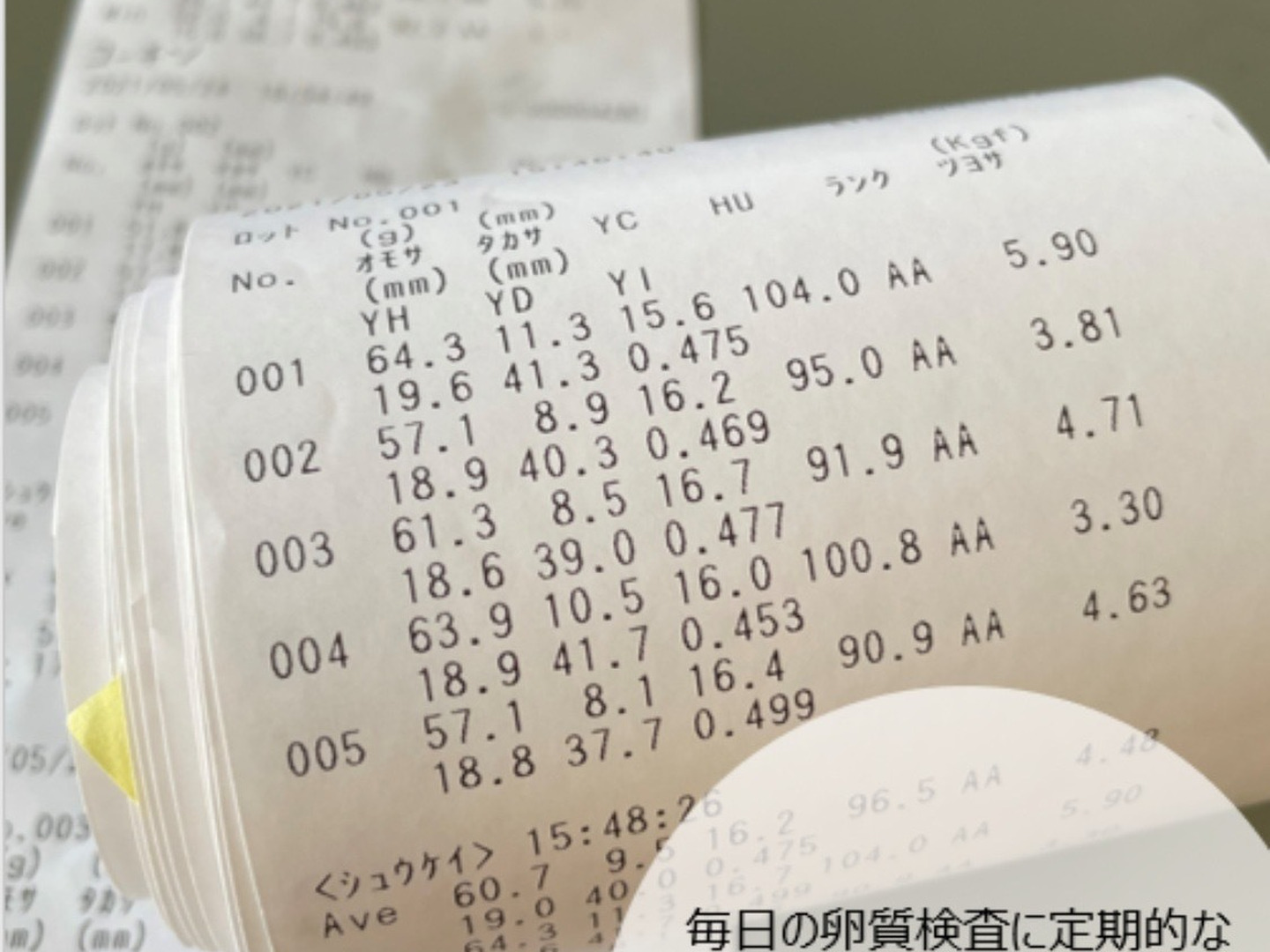 卵質やサルモネラ検査を定期的に行い、美味しさに安心を添えてお届けします。