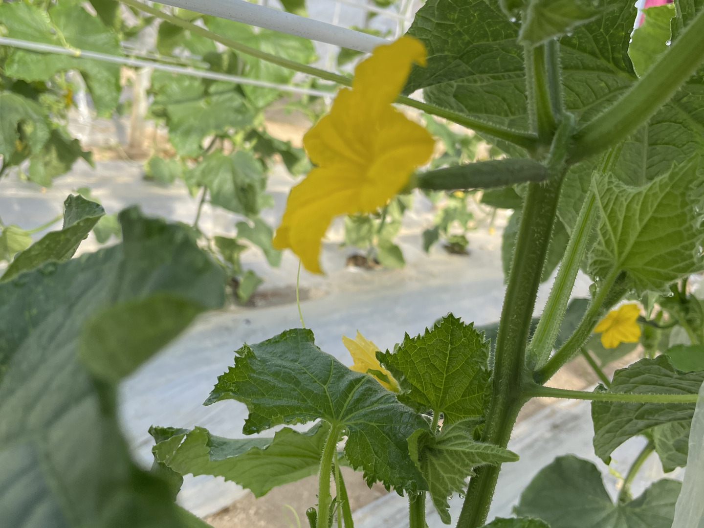 最近流行りの、枝がバンバン出てなんていう品種ではなく、おっとりとした性格の品種を栽培しています。樹勢管理が難しいところですが、木の消耗が少ないため、品質の良いきゅうりが長めに取れるのが特徴です。