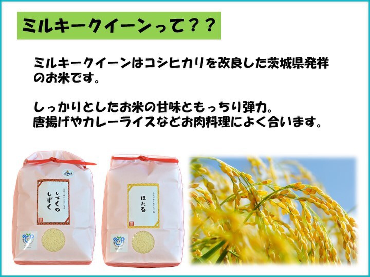 ミルキークイーンは、もっちりとした弾力をお米らしい甘みが感じられるのでお肉料理など洋食に。