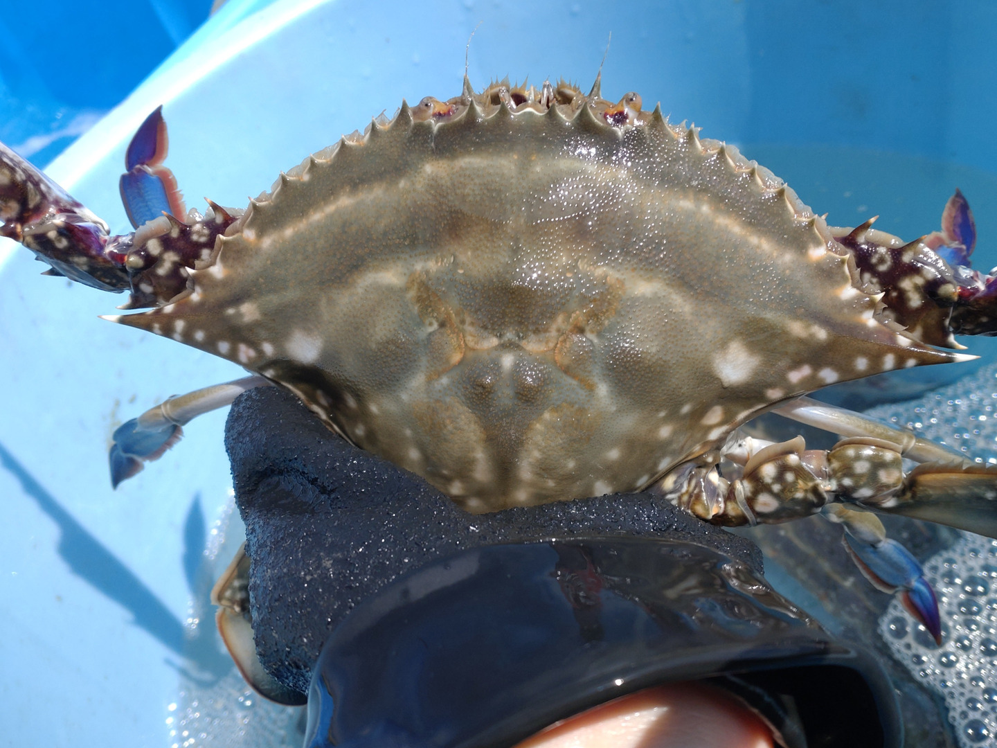 とりたての竹崎カニを氷水でしめてます。