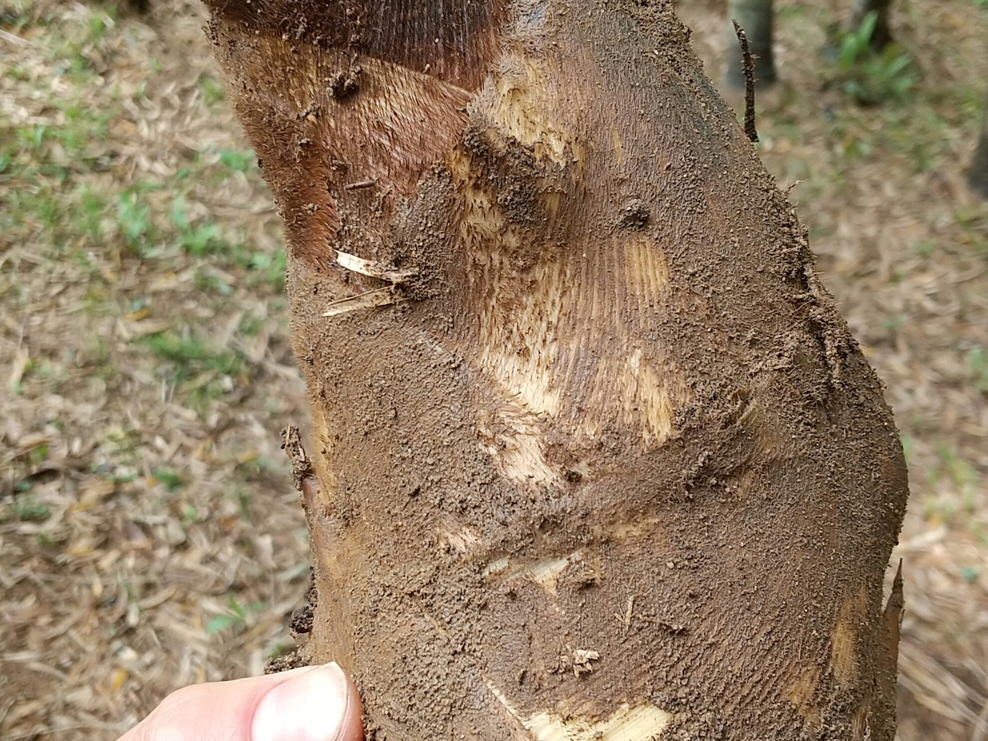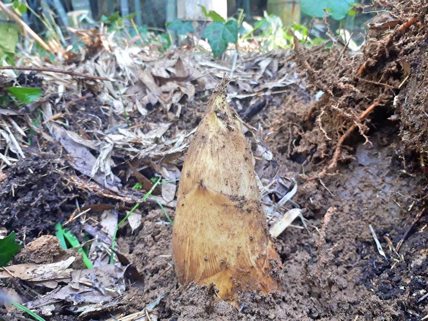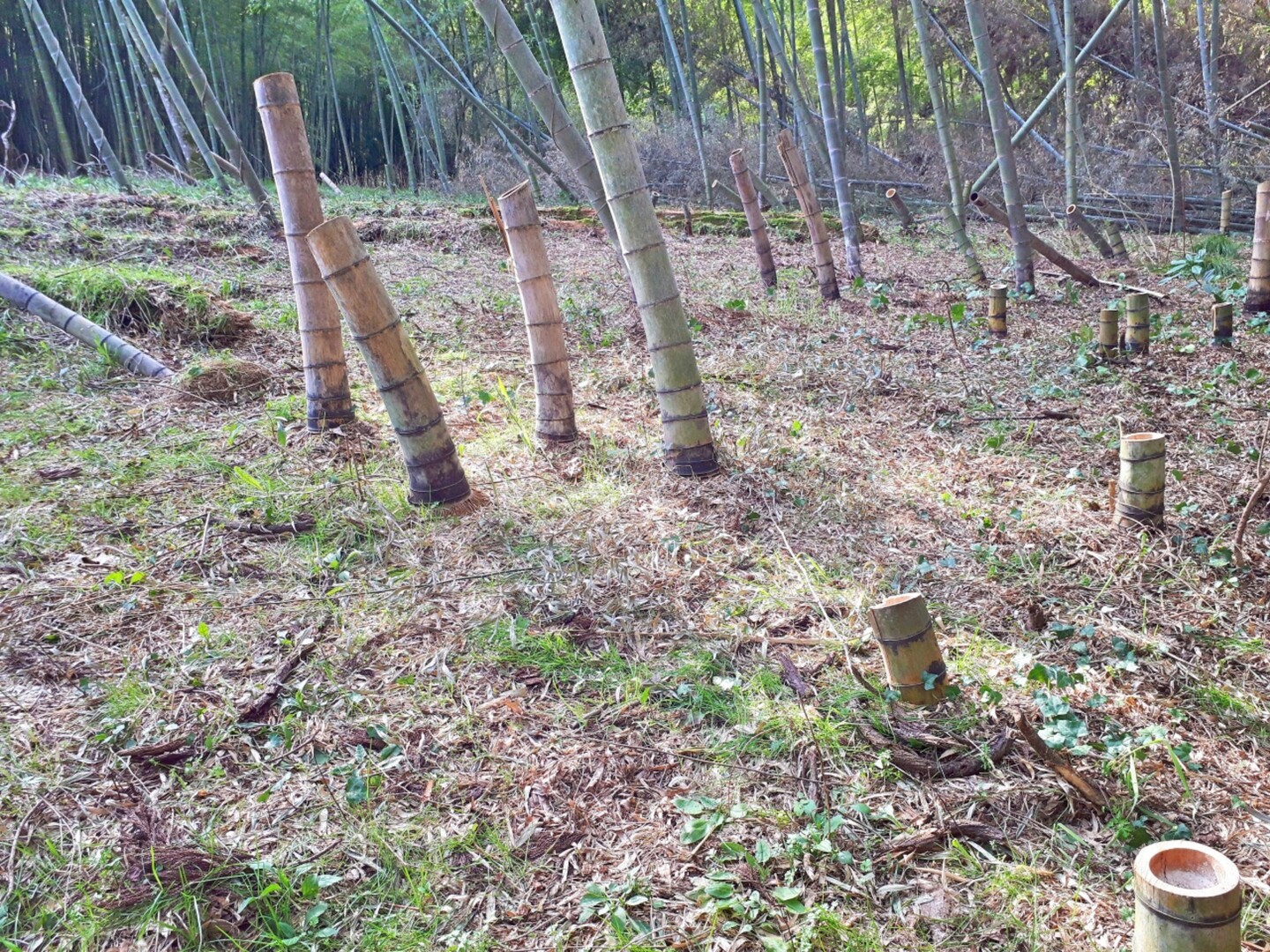 通常、タケノコ栽培では、タケノコが顔を出すのがすぐ分かるように、地面には枯れ葉一つ落ちていないようなツルツルの状態に管理するのですが、地面が剥き出しになることは不自然だと思い、あえてタケノコの落ち葉などをそのまま残して栽培しております。