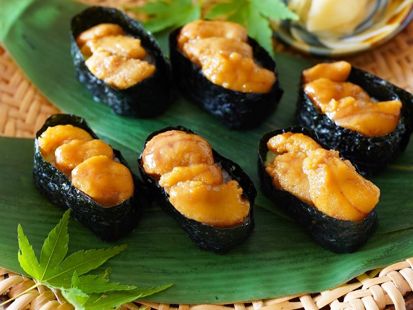 解凍したウニを焼きのりで、ご飯を巻き解凍したウニをのせ、わさび醤油を2,3滴で