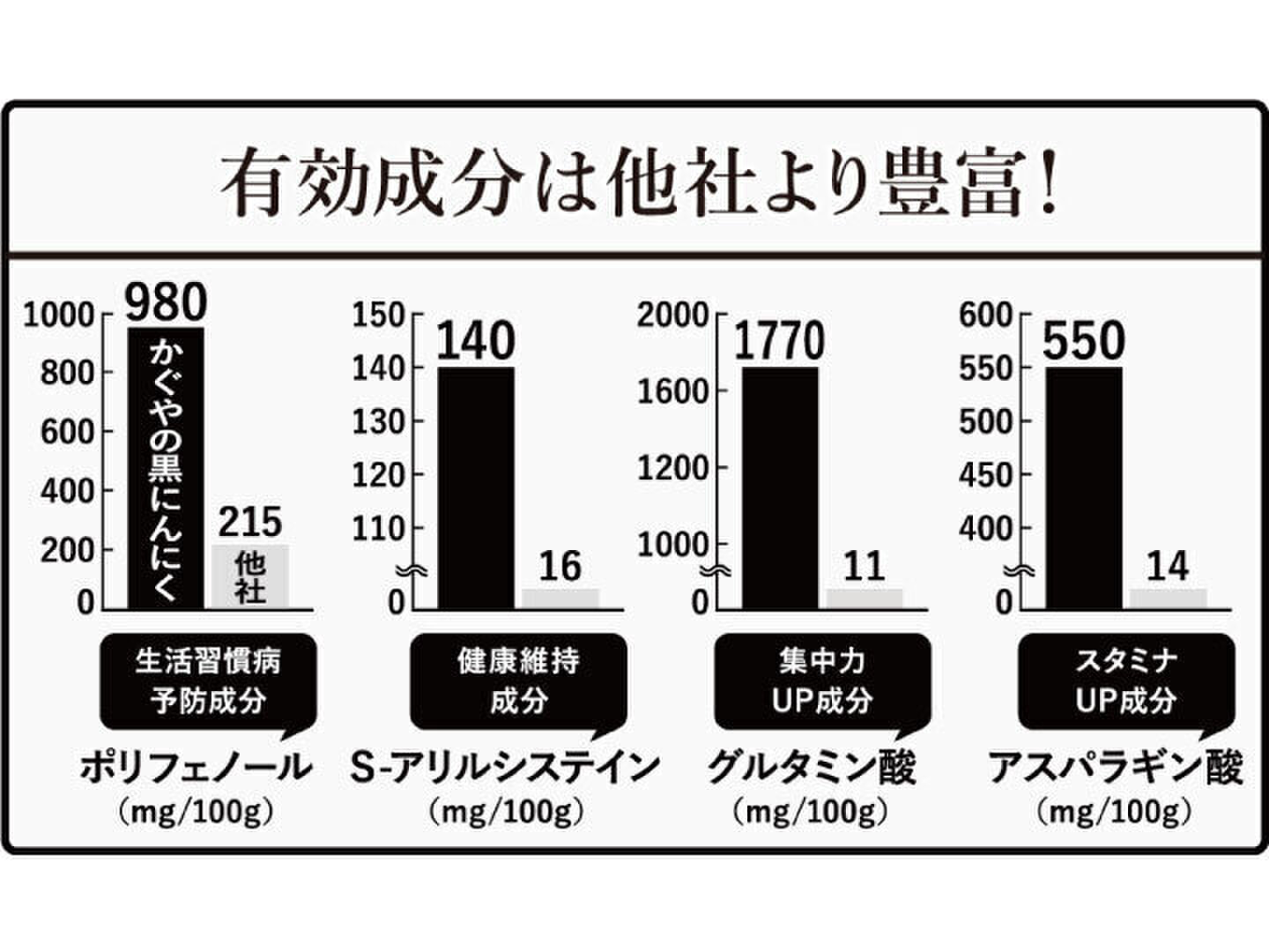 ⇒代表的なところでは【アミノ酸18種類】【S-アリルシステイン】【ポリフェノール】【GABA】が他社様の黒にんにくより数十倍~数百倍も多い結果に!!