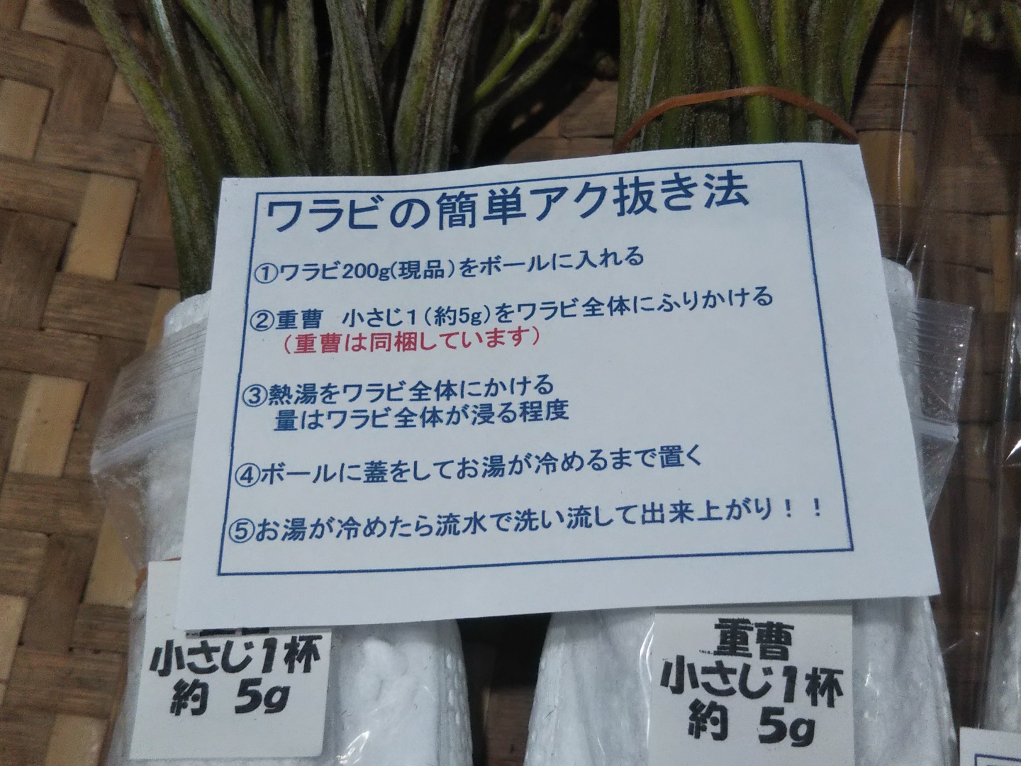 明朝発送できます。 ・わらびまとめ買い 4パック ・春一番採り「わらび」200gx④ ・あく抜きレシピと重曹付きで家庭でも簡単調理出来ます