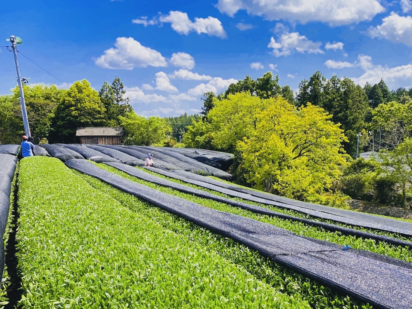●お茶の摘み取り2週間前に黒い覆いを被せています。旨味・甘味が増加し、まろやかな味わいになります。手間はかかりますが、おいしいお茶作りのためには欠かせない作業です。