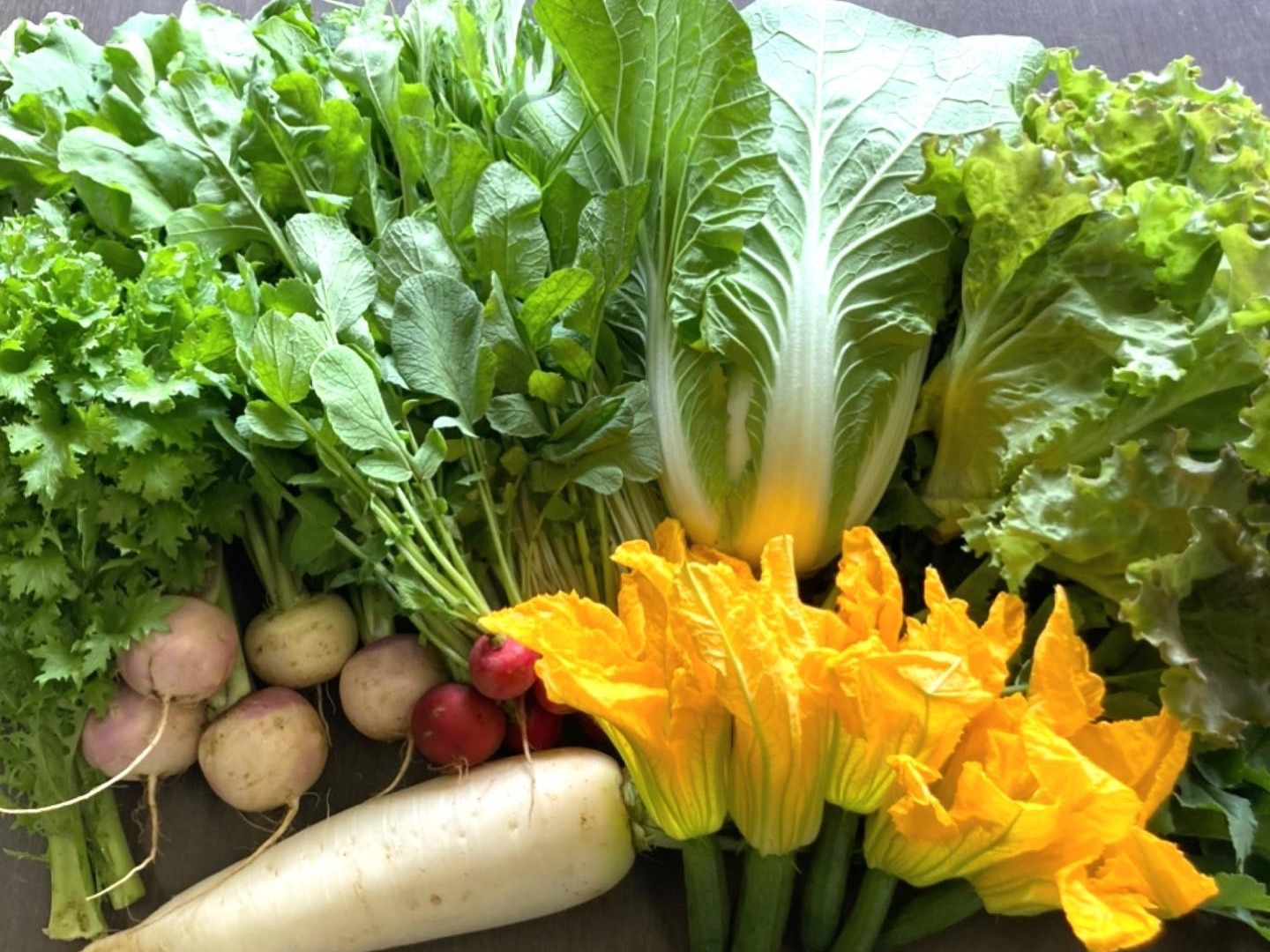 花ズッキーニ(5本)/ズッキーニ/そら豆/スナップえんどう/にんじん/サラダ白菜/ミニ大根/ほうれん草/ブロッコリー/サラダケール/小松菜/わさび菜/キャベツ/ルッコラ/などから収穫当日に選別