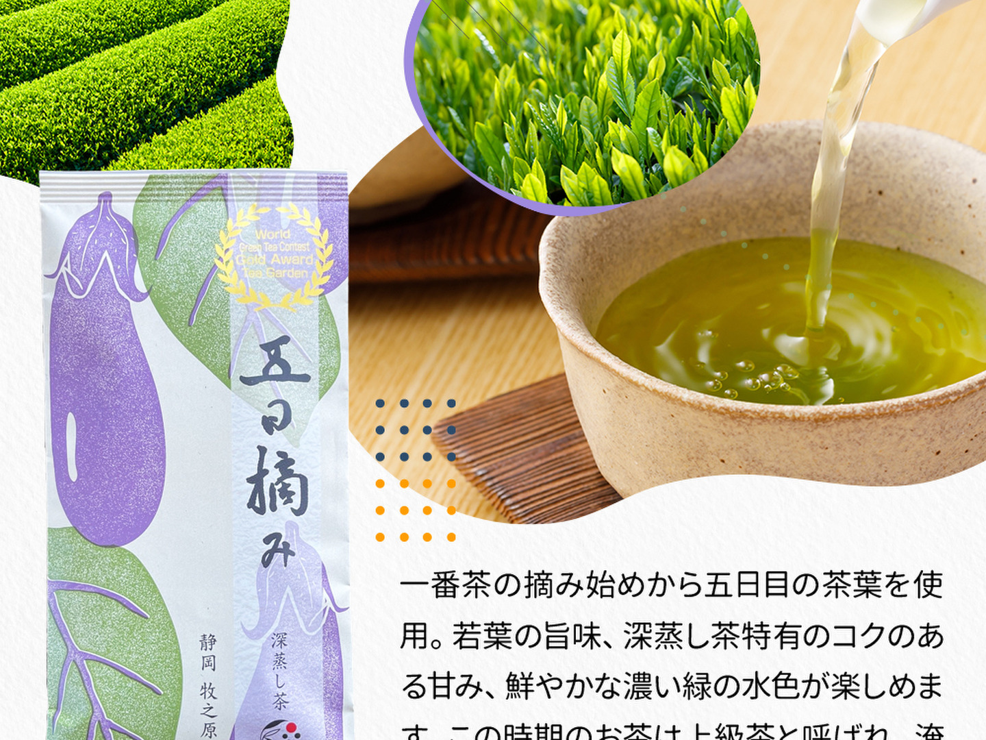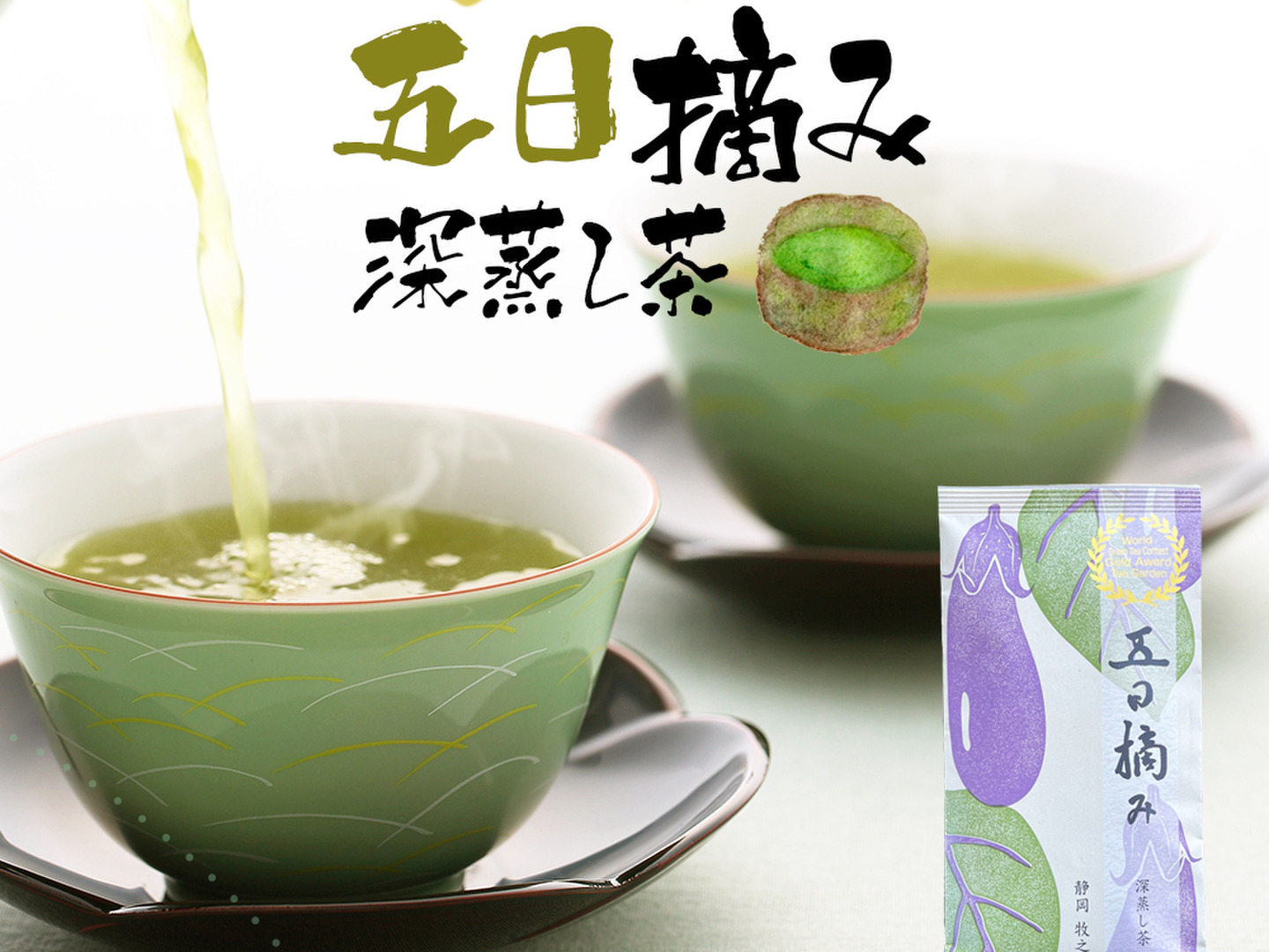 若葉の旨味、深蒸し茶特有のコクのある甘味、鮮やかな濃い緑色の水色が楽しめます。