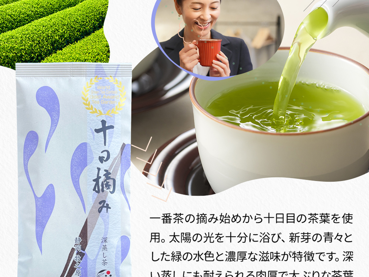 太陽の光を十分に浴びた、新芽の青々とした緑色の水色と濃厚な滋味が特徴のお茶です。