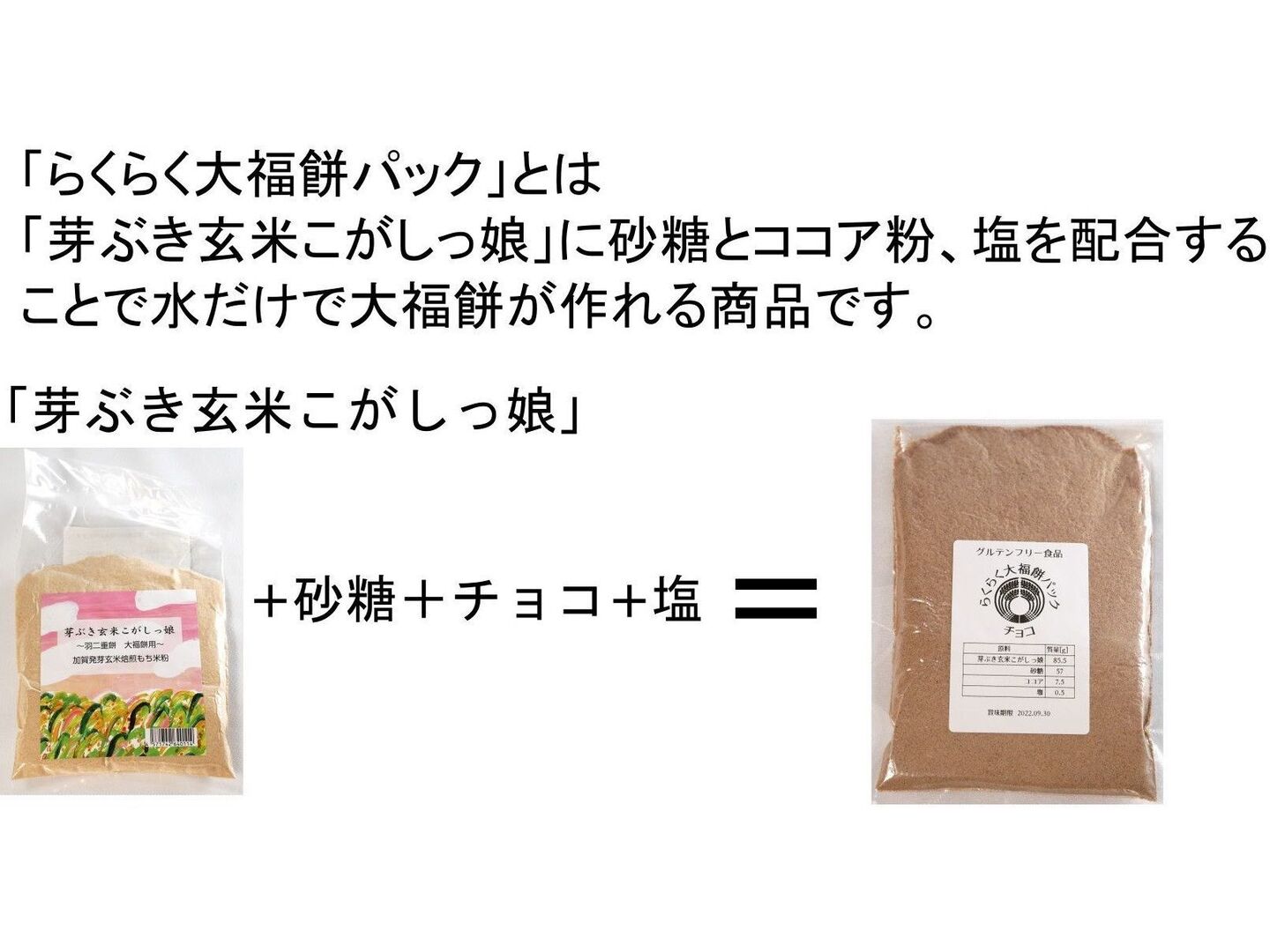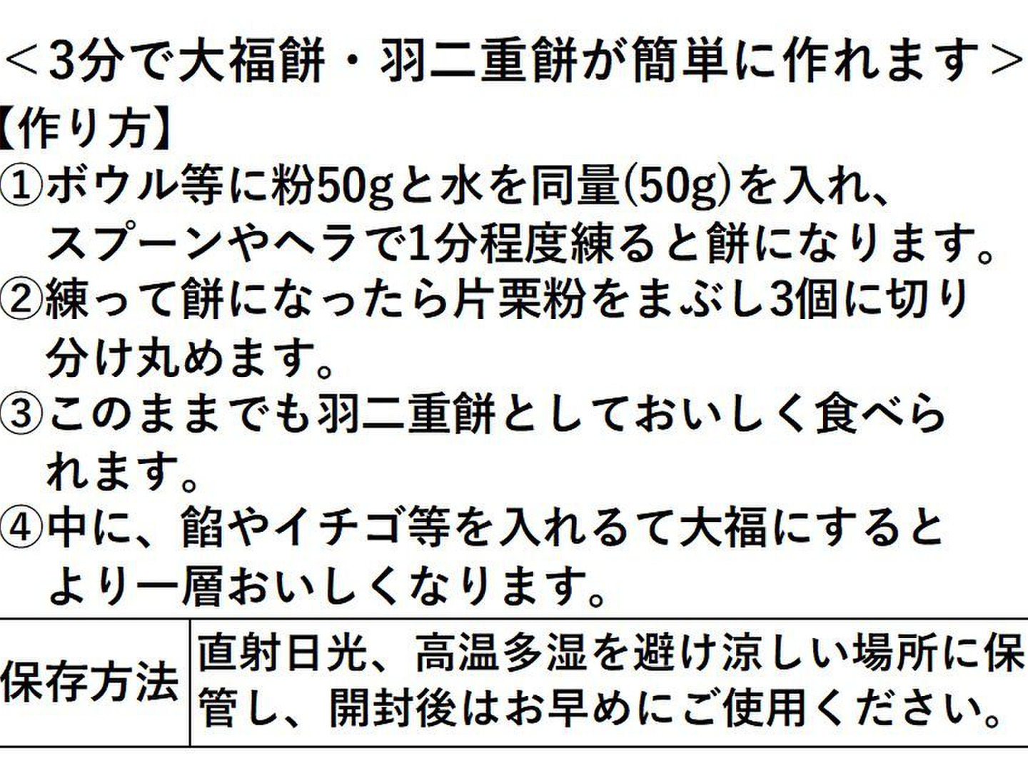 水だけを加えて混ぜるだけで熱を加えなくても短時間で簡単においしい大福餅が完成します。