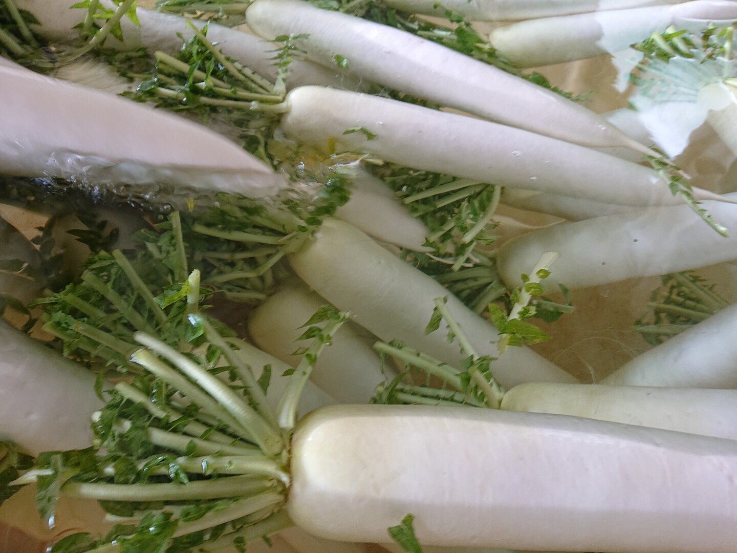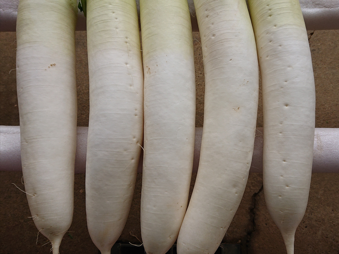 大根の肌艶に考慮し、水圧の調整による洗浄機を使用しています。大根の土が落ち、それでいて傷がつかない絶妙なバランスを保持することにより、見た目にも配慮した大根です。