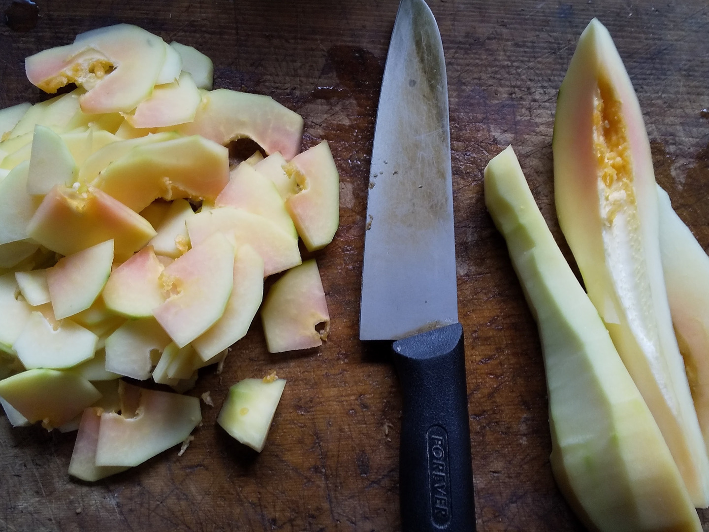 青パパイヤはフルーツではなく野菜です。半分に切って中の種を取り除いたら、皮を剥いでお好みの大きさにカットし、水にさらしてあくを抜いてください。