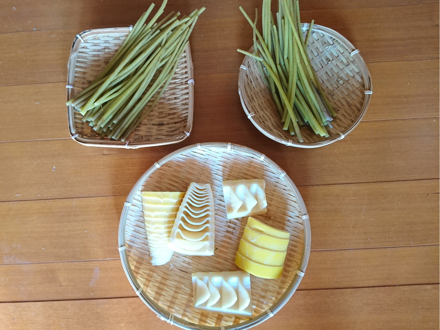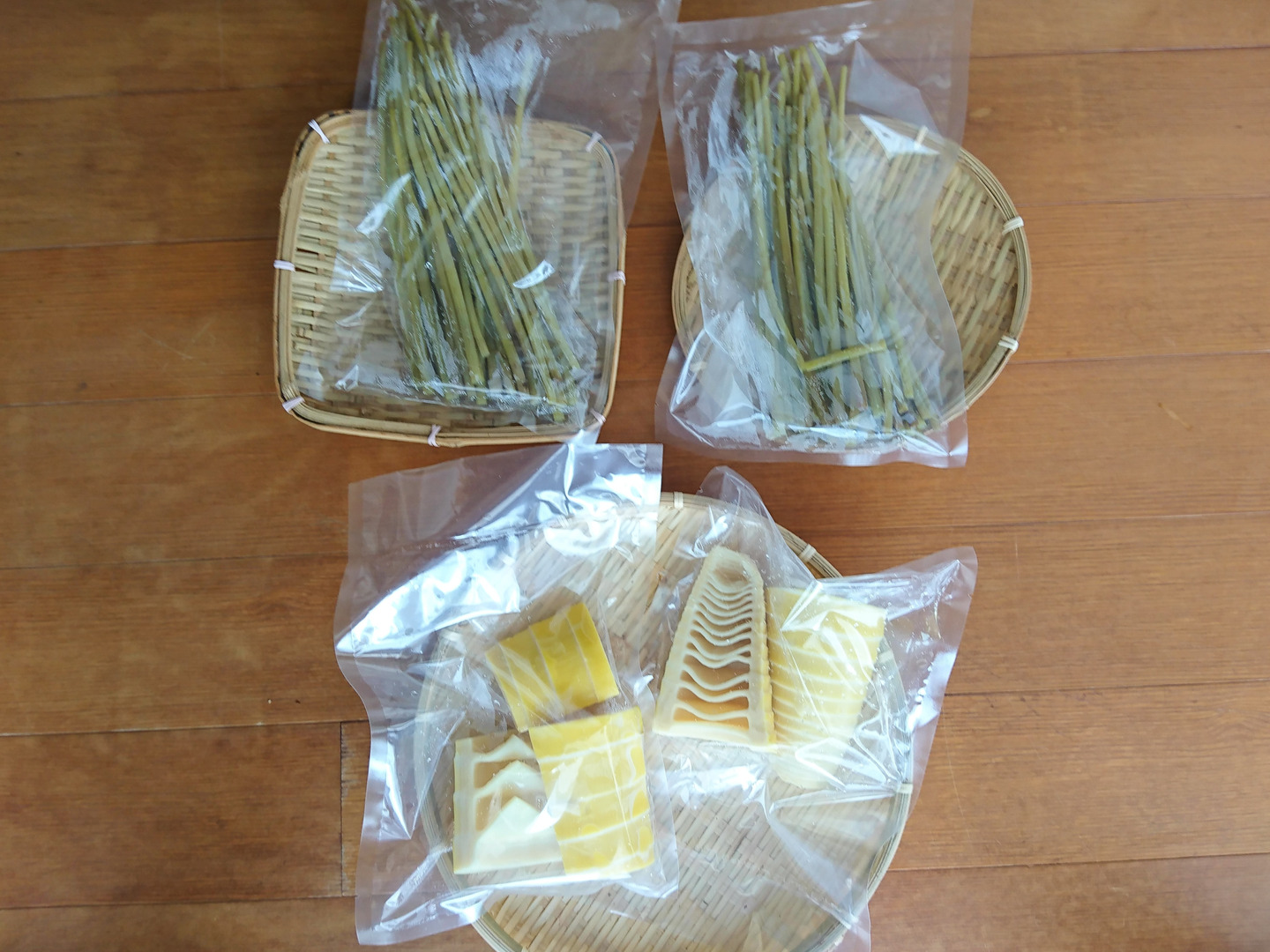 あく抜きしたふきを、密閉した袋にシールし袋詰め(200gr/袋x2)、竹の子も袋詰め(250grx2)