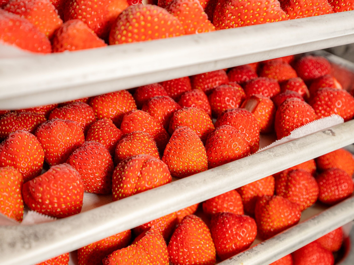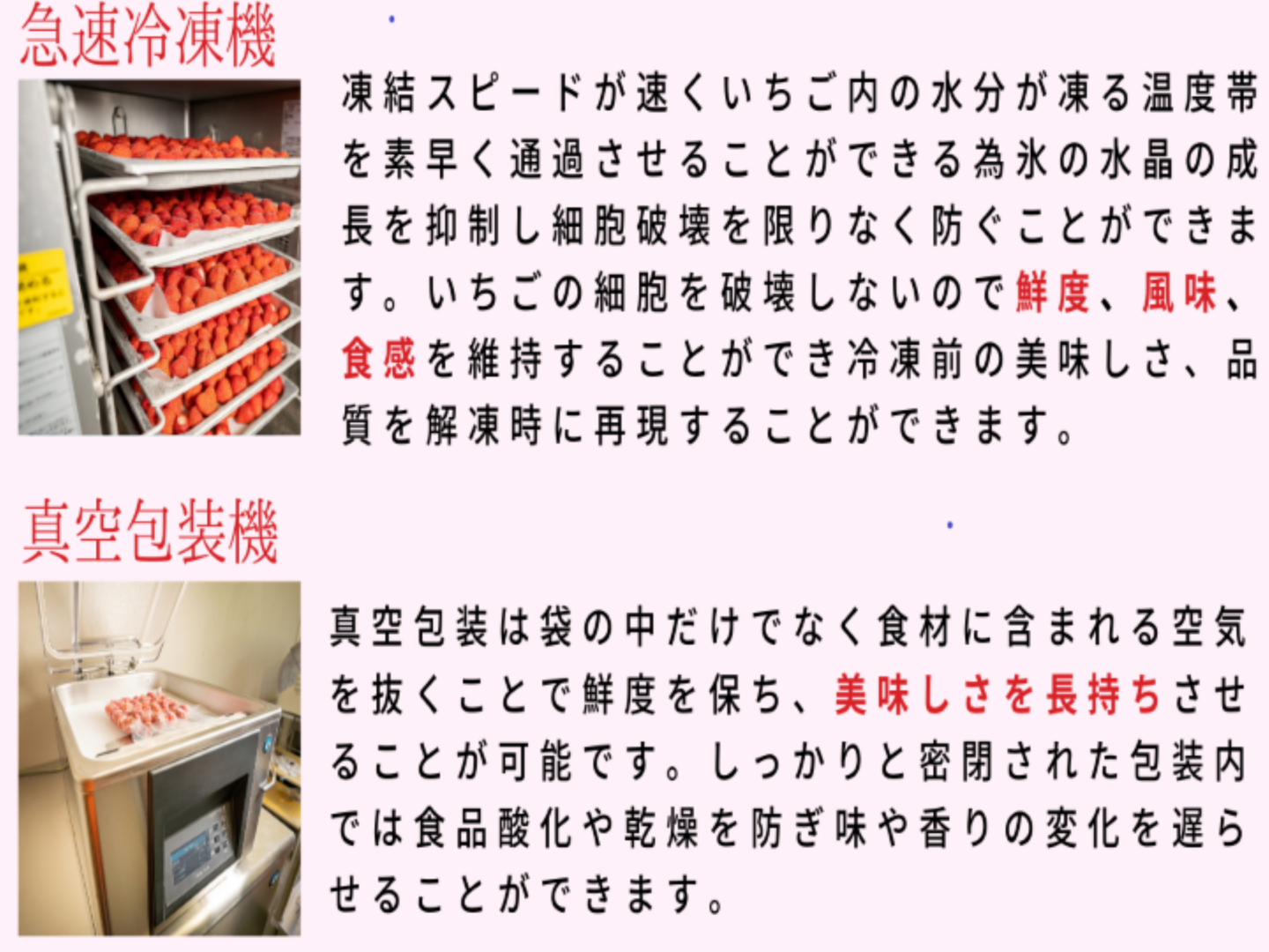 いちごの最適な環境にするためしっかり換気をすることで病害虫の発生を抑制します。元肥追肥に菌源炭をたくさん使用することで水も浄化します。直接、店頭販売するため安心で安全ないちご作りを心がけています。また急速冷凍機にて冷凍しているため、凍結スピードが速くいちご内の水分が凍る温度帯を素早く通過させることができる為氷の水晶の成長を抑制し細胞破壊を限りなく防ぐことができます。いちごの細胞を破壊しないので鮮度、風味、食感を維持することができ冷凍前の美味しさ、品質を解凍時に再現することができます。