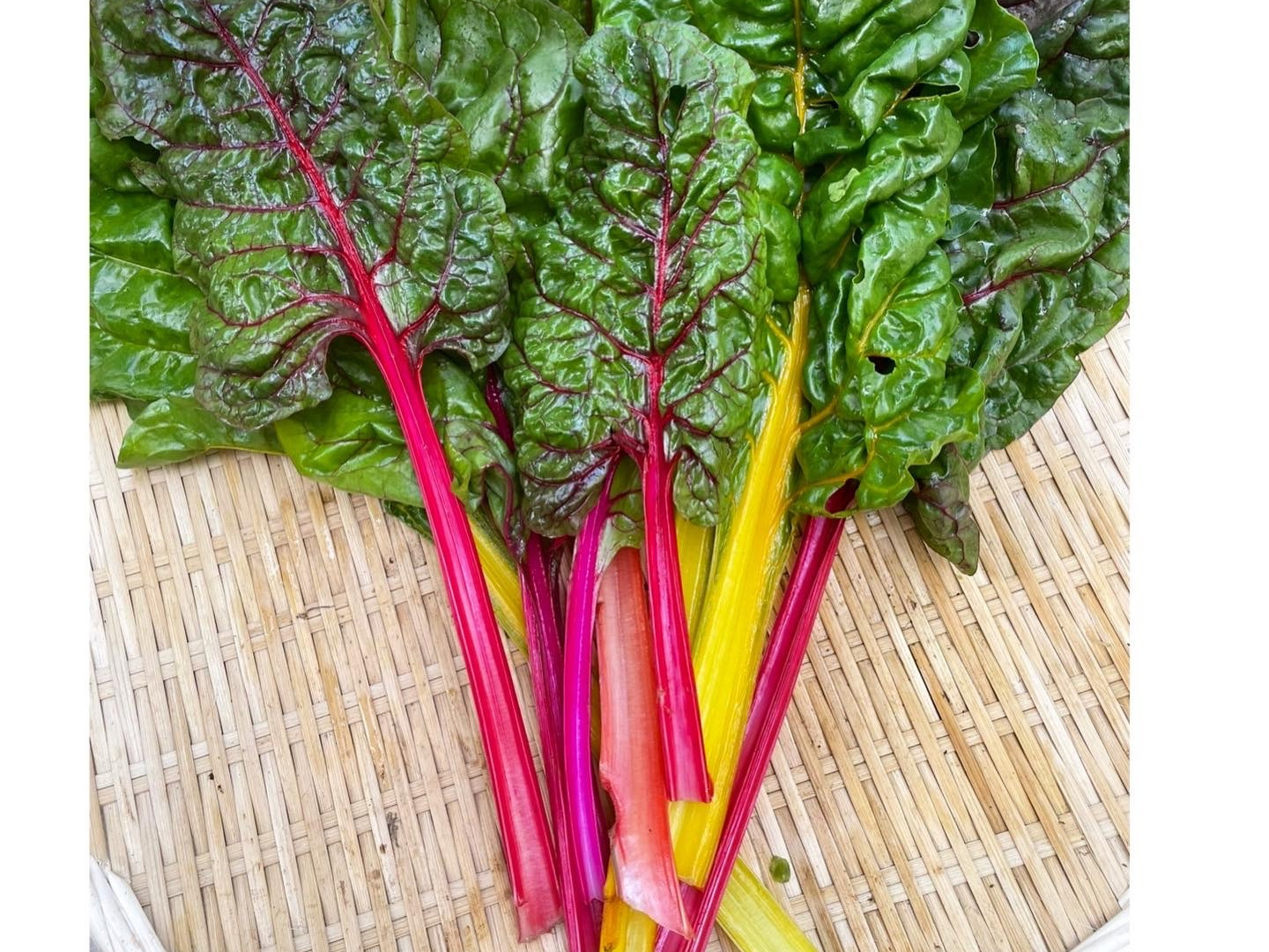 ロメインレタスは生でも加熱しても美味しく頂けます。水菜は若いので柔らかく、彩り豊かなスイスチャードは茎の部分の味がとっても個性があります。