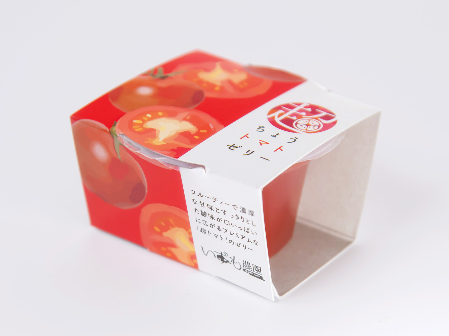 超トマトゼリーは、いずも農園の超トマトを使い、出雲市の吉岡製菓さんに開発・制作していただいたゼリーです。