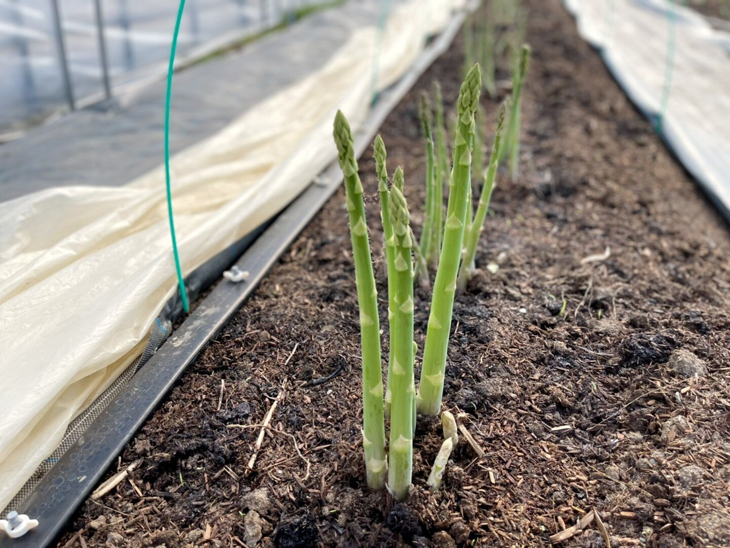 -馬糞は、牛糞や鶏糞などと比べても栄養価が高く手に入りにくいため、高価で流通しており、畑の堆肥としては嫌厭されがちです。しかし、スリービレッジファームでは、その馬糞が手に入りやす日高町という地の利を最大限生かして畑の土作りを行っています。もちろん、太さ長さ共にアスパラガスの成長は著しく、こだわりの土作りの恩恵をたくさん受けたアスパラガスは、野菜特有の抜群の優しい甘みを持ち育ちます。
