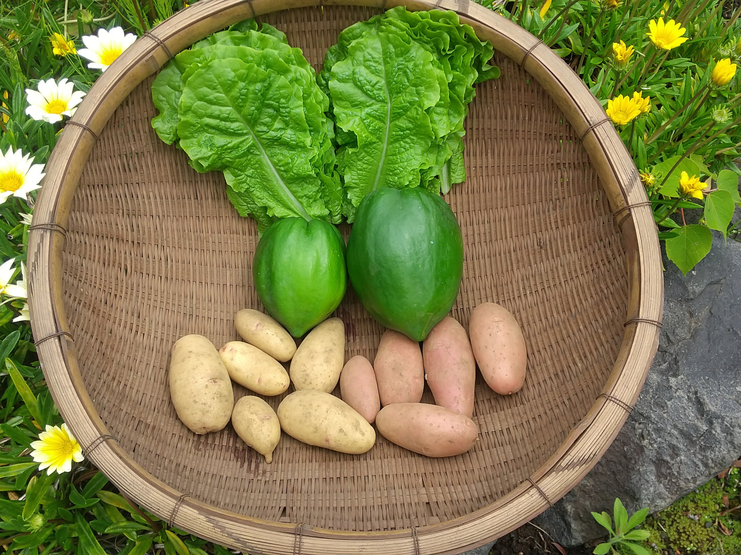 青パパイヤ 1キロ。新ジャガイモ・ピルカ500g。新ジャガイモ・シェリー 500g。サンチュ 1束。