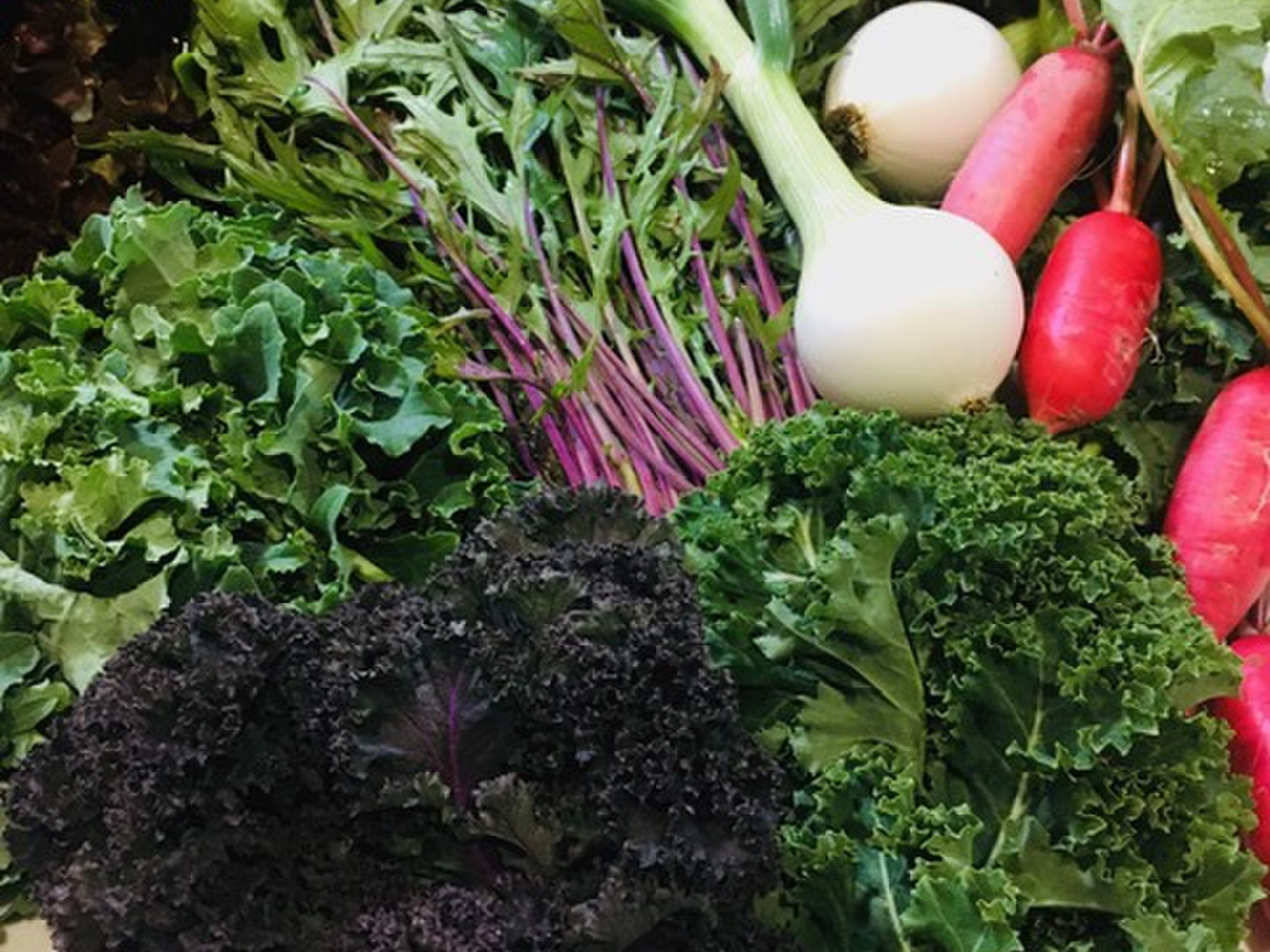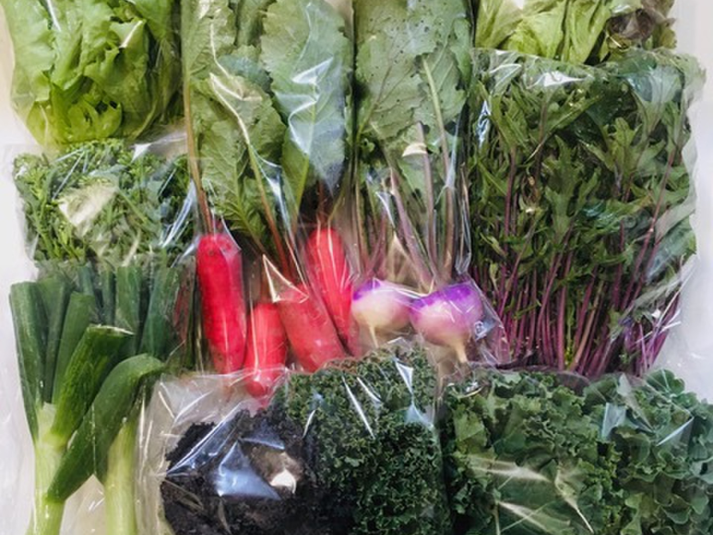メインはケール、リーフレタス、ラディッシュ。その他その時採れる野菜が少し入っています。(写真にある新タマネギは在庫がなくなり次第終了。その分ケールが入ります)