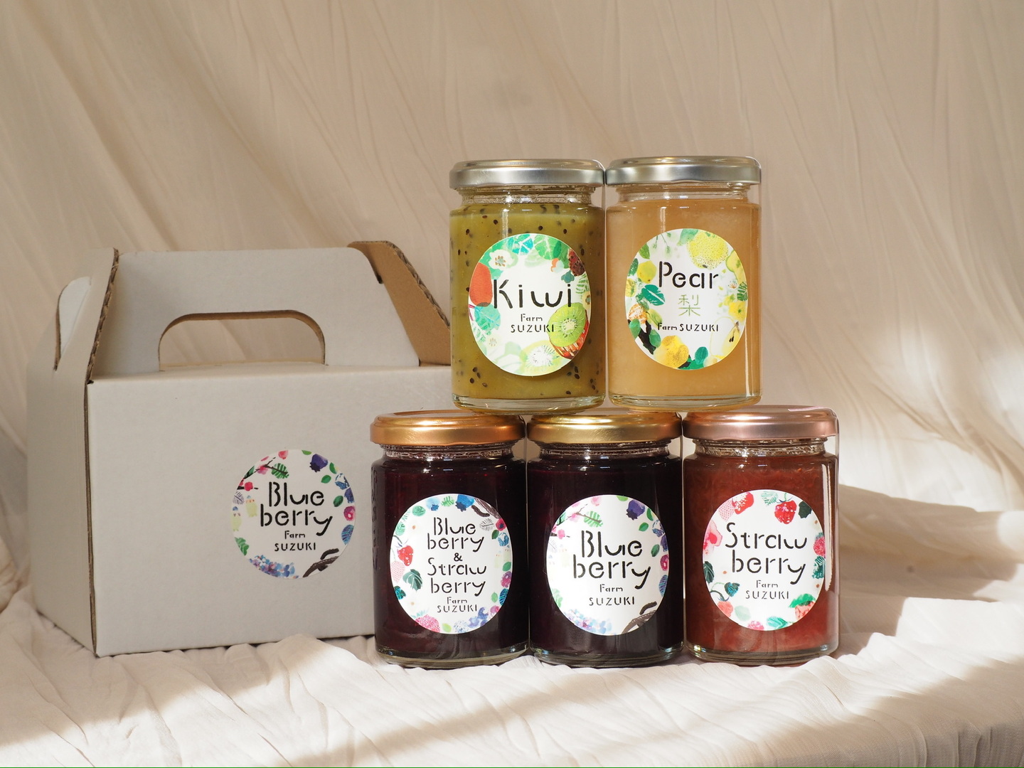 | 内容 | ブルーベリージャム、梨ジャム、いちごジャム、 ブルーベリーといちごのミックスジャム、キウイジャム | ||||||