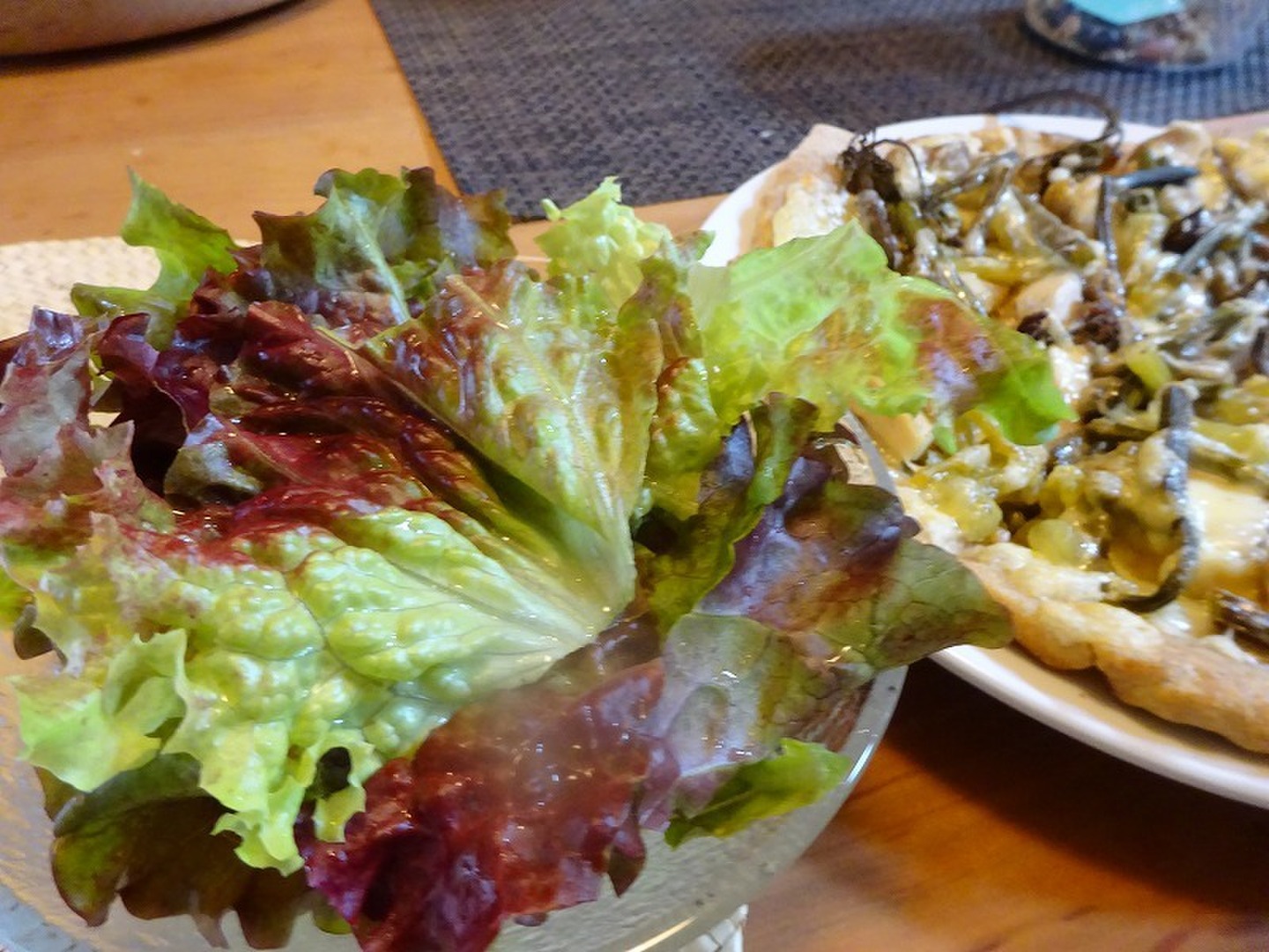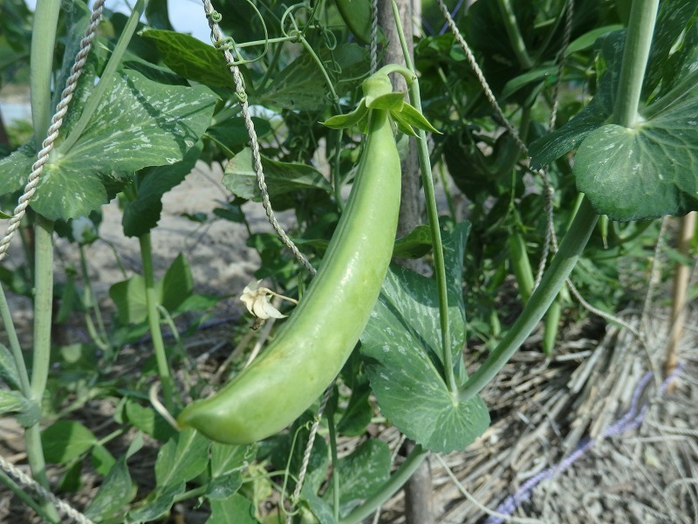 レタスだけだと少しさみしいので、スナップえんどうを100gほどと、例によって畑をぐるっとまわってサラダの彩になるものを捜してみたいと思います。