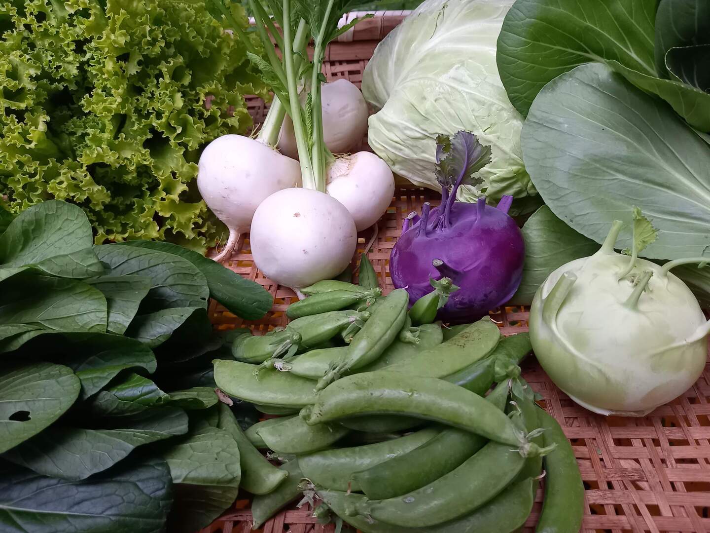 春野菜は小松菜、春キャベツ、スナップエンドウ、レタス、チンゲンサイ、カブ、カリーノケール、コールラビなどからおまかせでチョイスします。