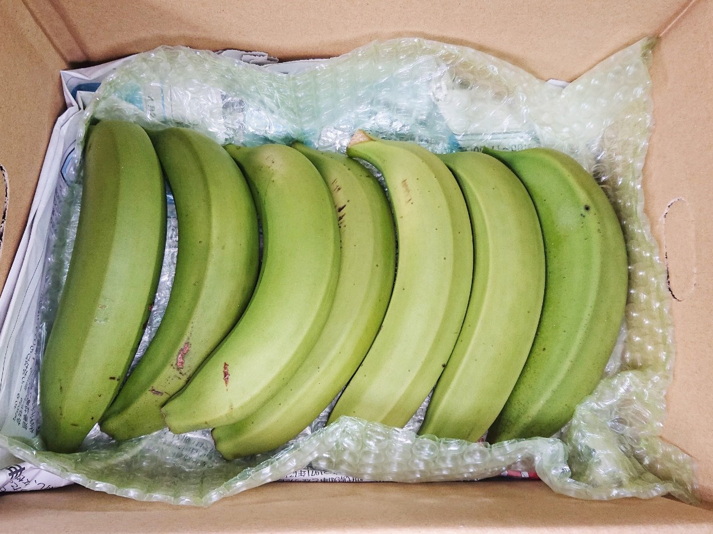 ビニール袋に入れて温かい場所に保管して下さい、一緒にりんごをいれてると追熟が早まります(りんごから出るエチレンガスの効果)ある程度黄色くなりましたらリンゴを出しシュガースポット(黒くなったら)が出たら食べごろです。