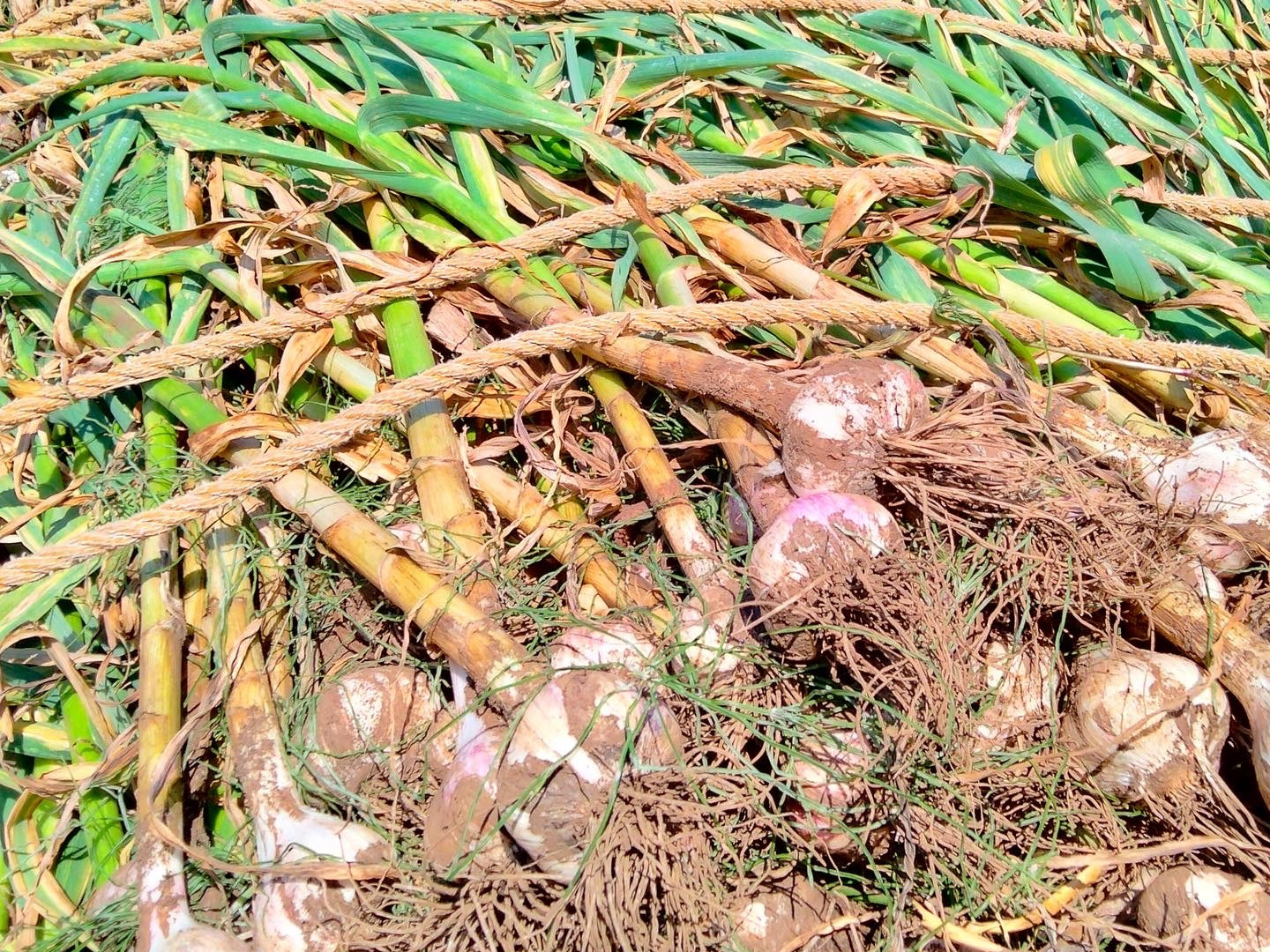 収穫したニンニクを長期保存できるようにしっかりと乾燥させています。