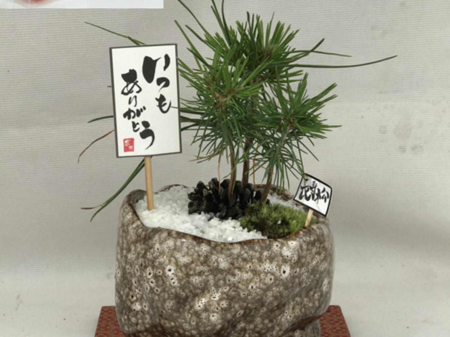 ※写真はイメージです。松は生きている植物なので、個性があり、高さや松の本数は個体により異なります。松ぼっくりの個体差もありますので、より美しく見えるよう、松ぼっくりの向きやピックの挿し位置、松の植え込み位置も異なります。ご了承くださいませ。