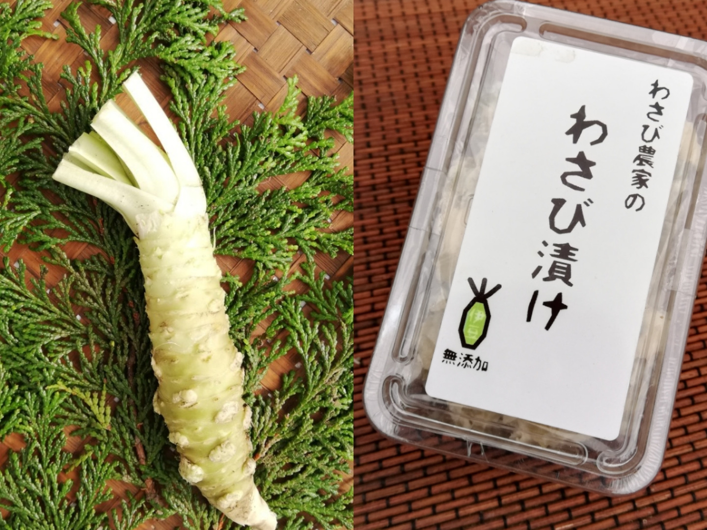 豊富な湧水の中、世界農業遺産に認定された「畳石式」のわさび沢で農薬、化学肥料不使用で育ったわさび。