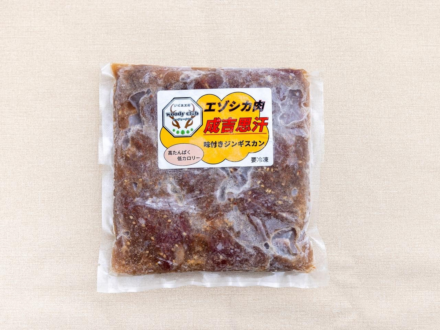 エゾ鹿モモ肉のスライスを、醬油ベースでフルーツをたっぷり入れた自家製タレにしっかり漬け込み柔らかく仕上げています。