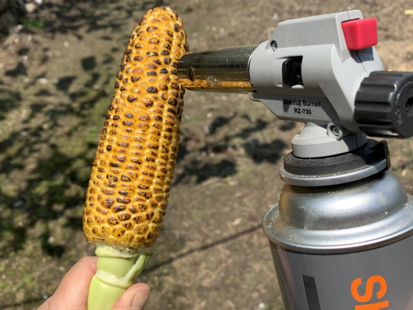 皮を全部剥いたら、バーナーで炙る!アウトドアにオススメの逸品。醤油を垂らすと甘味が際立ちます。
