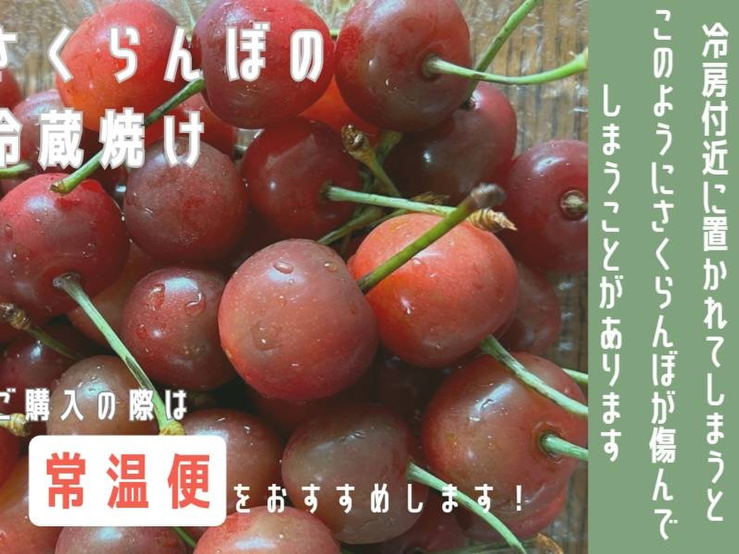 さくらんぼは非常に繊細な果実です。万全な状態で出荷しておりますが、果実の性質上、輸送中の振動等で若干の表面のこすれや果汁漏れがある場合がございます。何卒、その旨をご理解・ご了承していただいた上でご購入いただきますようお願いいたします。
