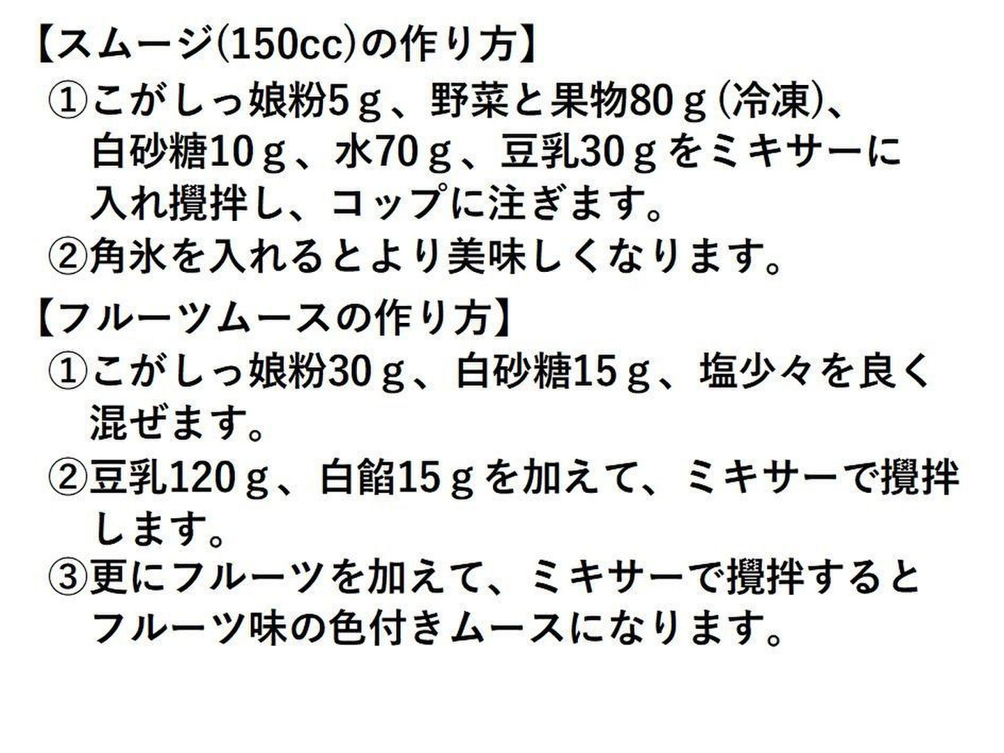 ①こがしっ娘粉5g、野菜と果物80g(冷凍)、白砂糖10g、水70g、豆乳30gをミキサーに入れ攪拌し、コップに注ぎます。