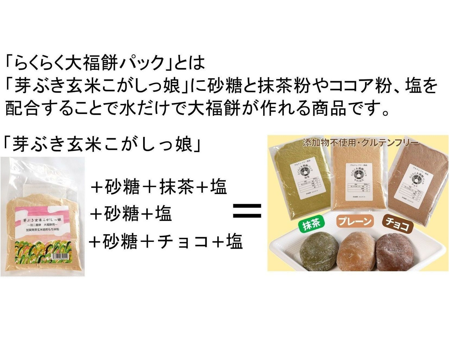 自分でアレンジした大福を作りたい方は「芽ぶき玄米こがしっ娘150g」も有ります。