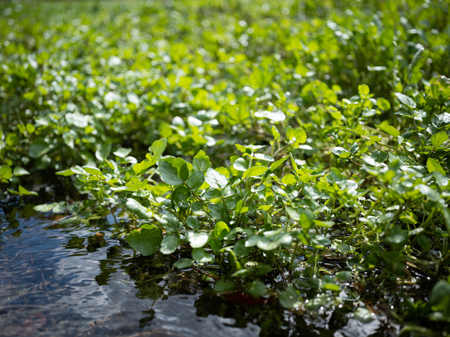 クレソンは、ワサビやダイコンと同じアブラナ科の植物でピリッとした味とコショウのような香りが特徴です。中でも私たち七花ファームの育てたクレソンは、取引のあるシェフさんからクセがなくサラダなど生で頂くのに向いていると評価していただいています。