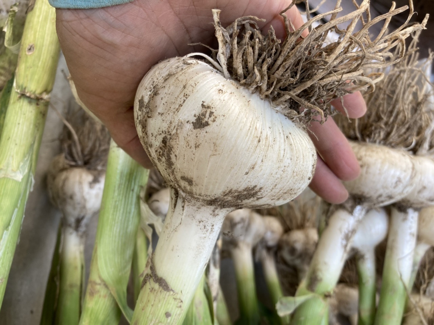 ・にんにく(自家採取種子、栽培状況により一片種と片が分かれたものどちらかが入っております。サイズ不揃いですがご了承下さいませ)約2個