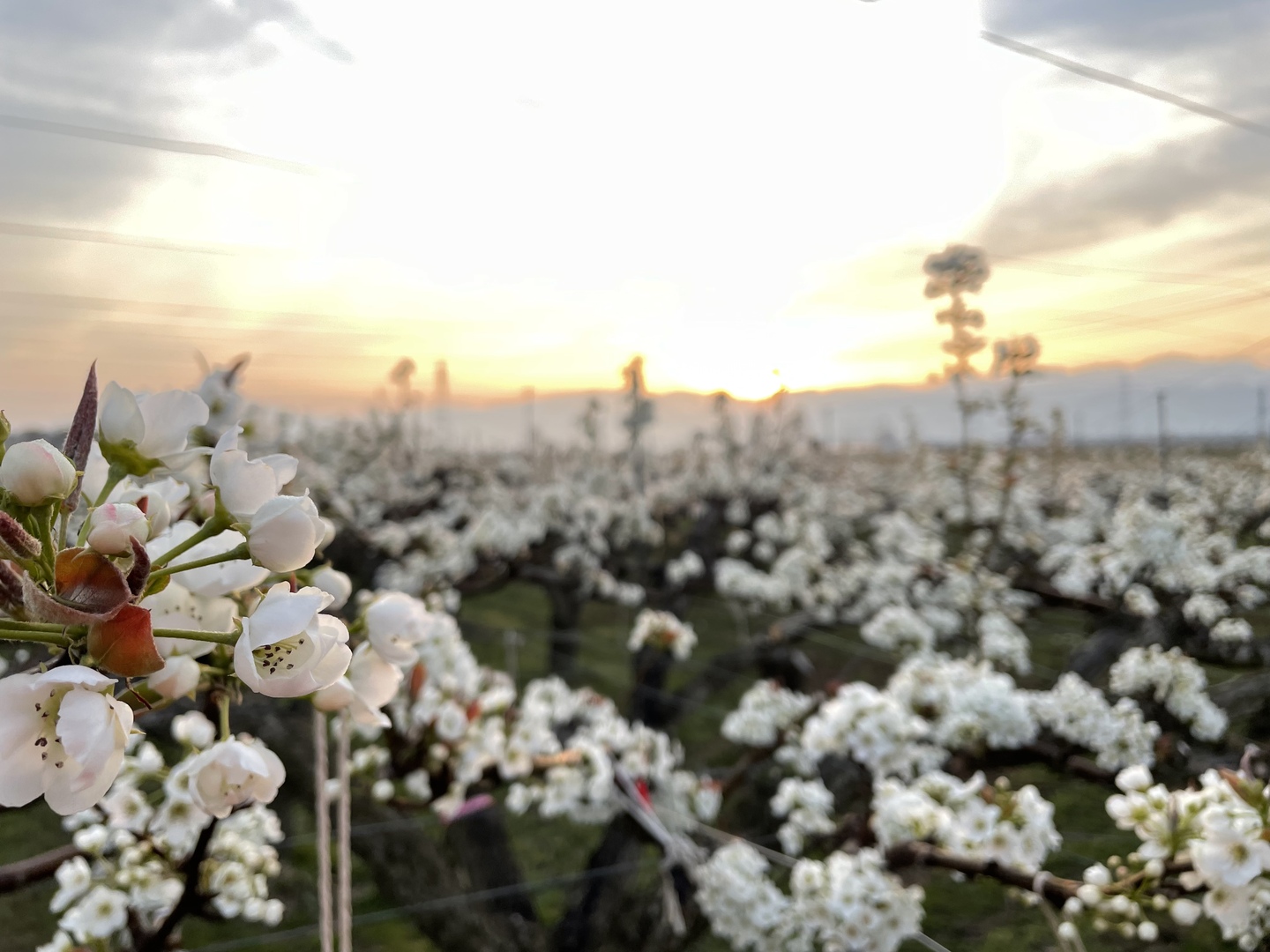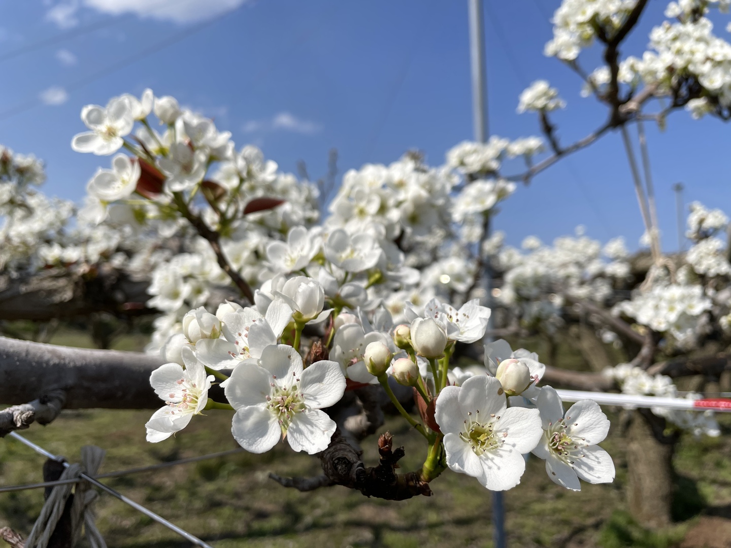 梨の花は4月上旬に咲きます。昨今の地球温暖化現象の影響をうけて毎年、遅霜の被害に遭われます。花が凍霜害に遭うと梨の実が出来ません。当農園では、霜注意報が出た夜中1時頃から圃場に行き一斗缶に灯油を入れて約10m間隔に配置して火を付けて圃場内の空気を暖めて対策しています。また、防霜ファンを併用することで圃場内の空気を混ぜて霜が降りないよう対策しています。そのおかげで今年も南水梨の実がしっかりと出来ました♪収穫は9月とまだまだ先ですが、これからまだ自然被害が出ない様に願いながら美味しい梨を皆様にお届け出来たらなと思っています。