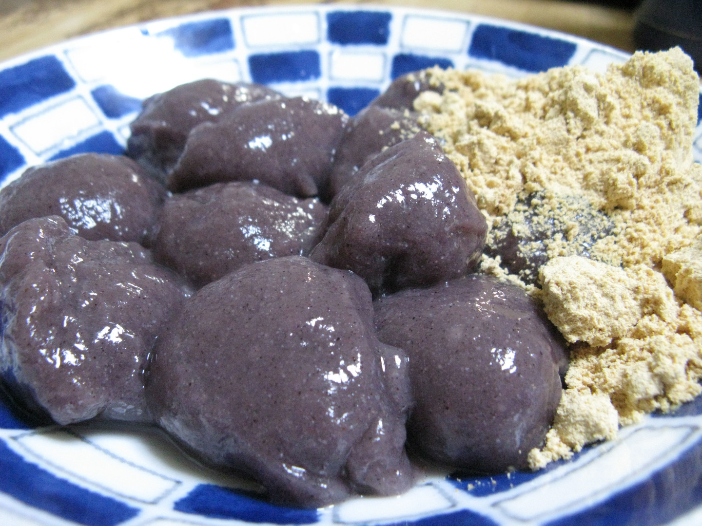 使い方:市販の白玉粉に白玉粉の30%程度の「古代米もち米粉」、50%の砂糖、合わせた量と同量の水を加えよく混ぜ、電子レンジで加熱、少し固まりかけたら一回取り出し混ぜて、再度電子レンジで様子を見ながら全体がかえり、少し冷めたら片栗粉をまぶしながら丸めると和菓子の出来上がり。