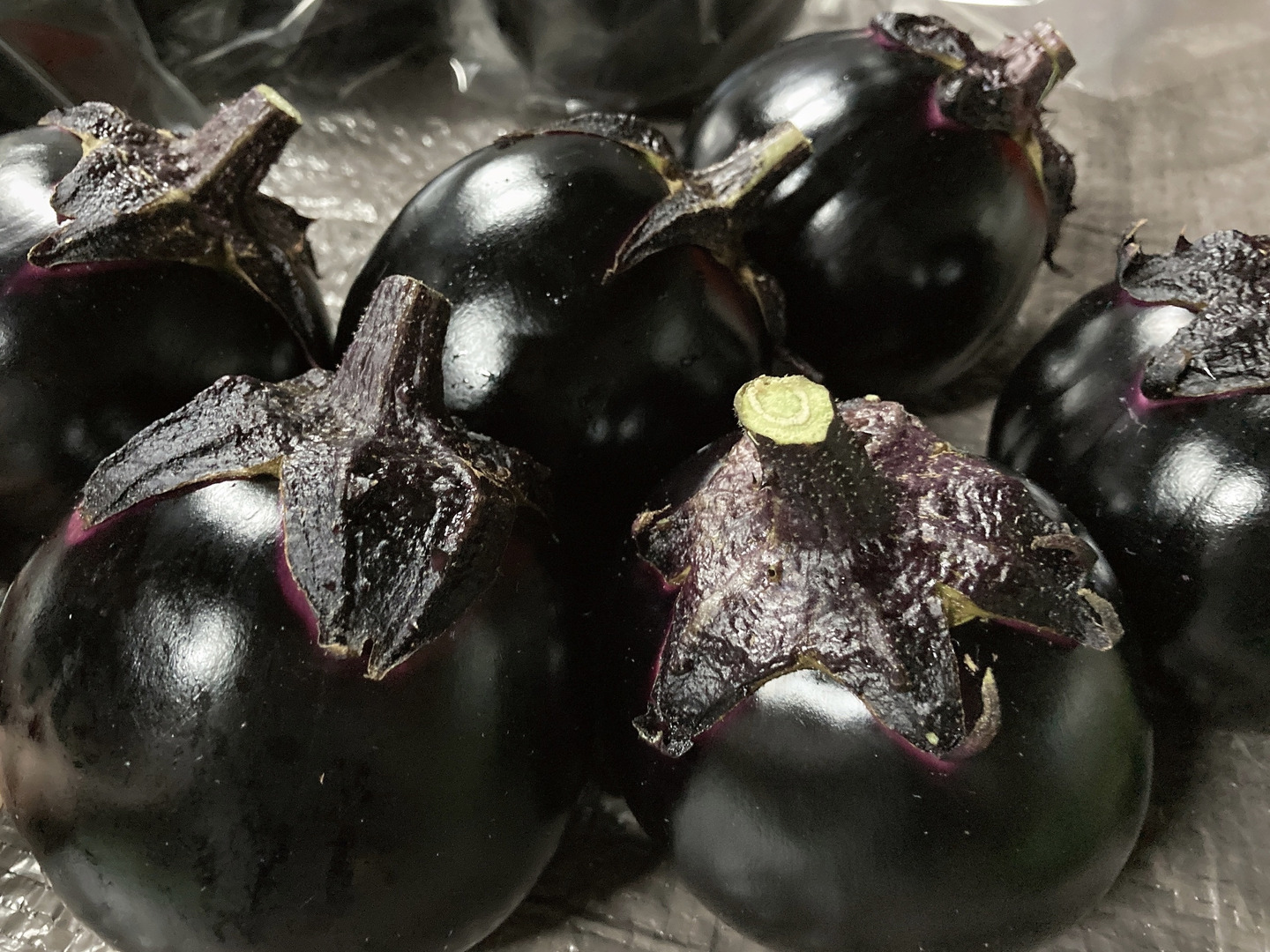 大和丸なすは、奈良県が認定する「大和の伝統野菜」のひとつです。直径約10センチと大きく丸い形とつやのある紫黒色で色つやがよく、皮にピンと張りがあり、ヘタに太いとげのあるのが特徴です。