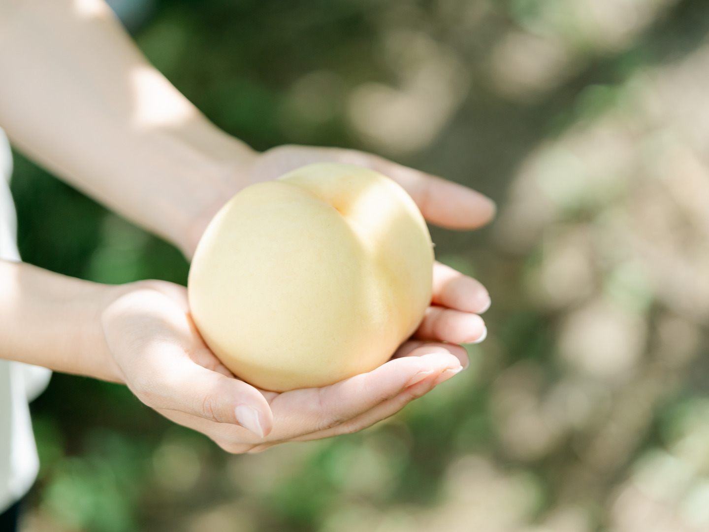 たいへんな作業ですが、太陽の光を直接浴びない桃は赤く色づかず、透き通るように白くてなめらかな口当たりの桃に育ちます。