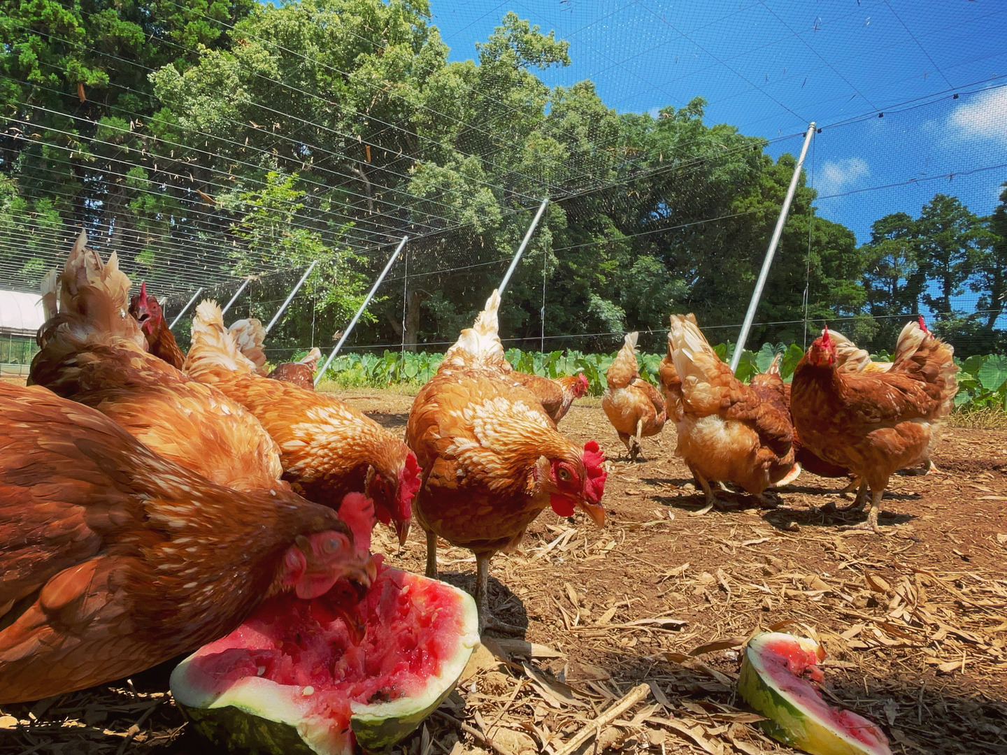 ナチュラルエッグラボの鶏たちは、屋外で太陽の下、各々楽しみながら過ごします。