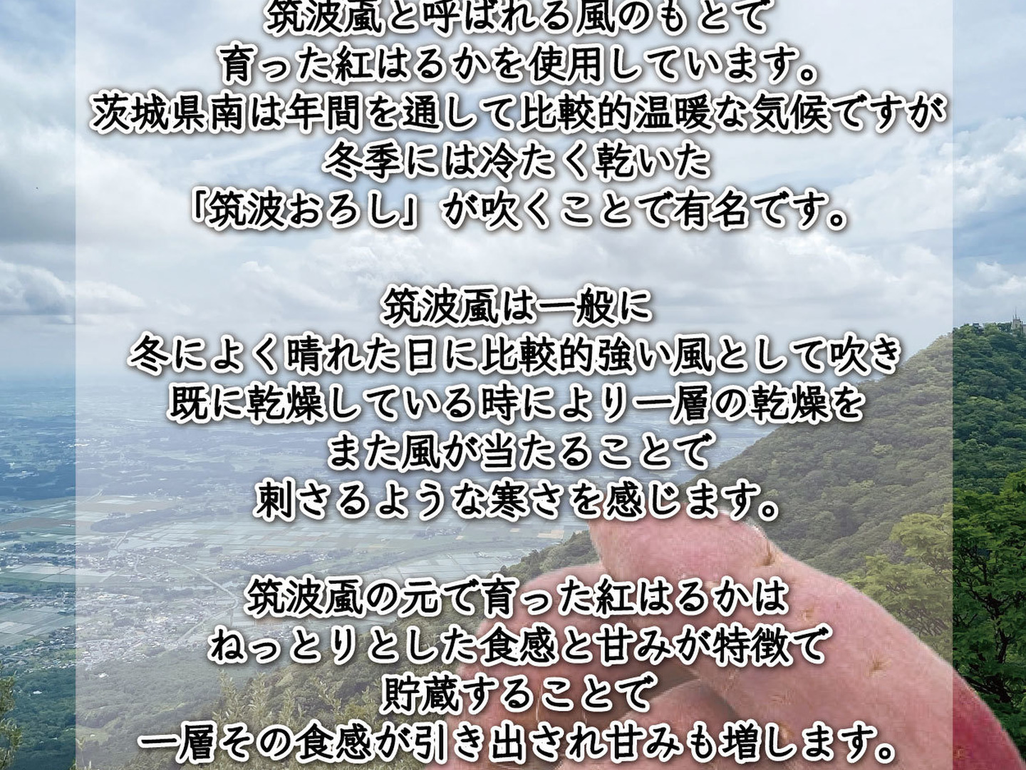 ありがとうの干し芋せんべいに使用している茨城県産「紅はるか」は暖かい太陽をいっぱい浴び、筑波山の風のもとで育てました。