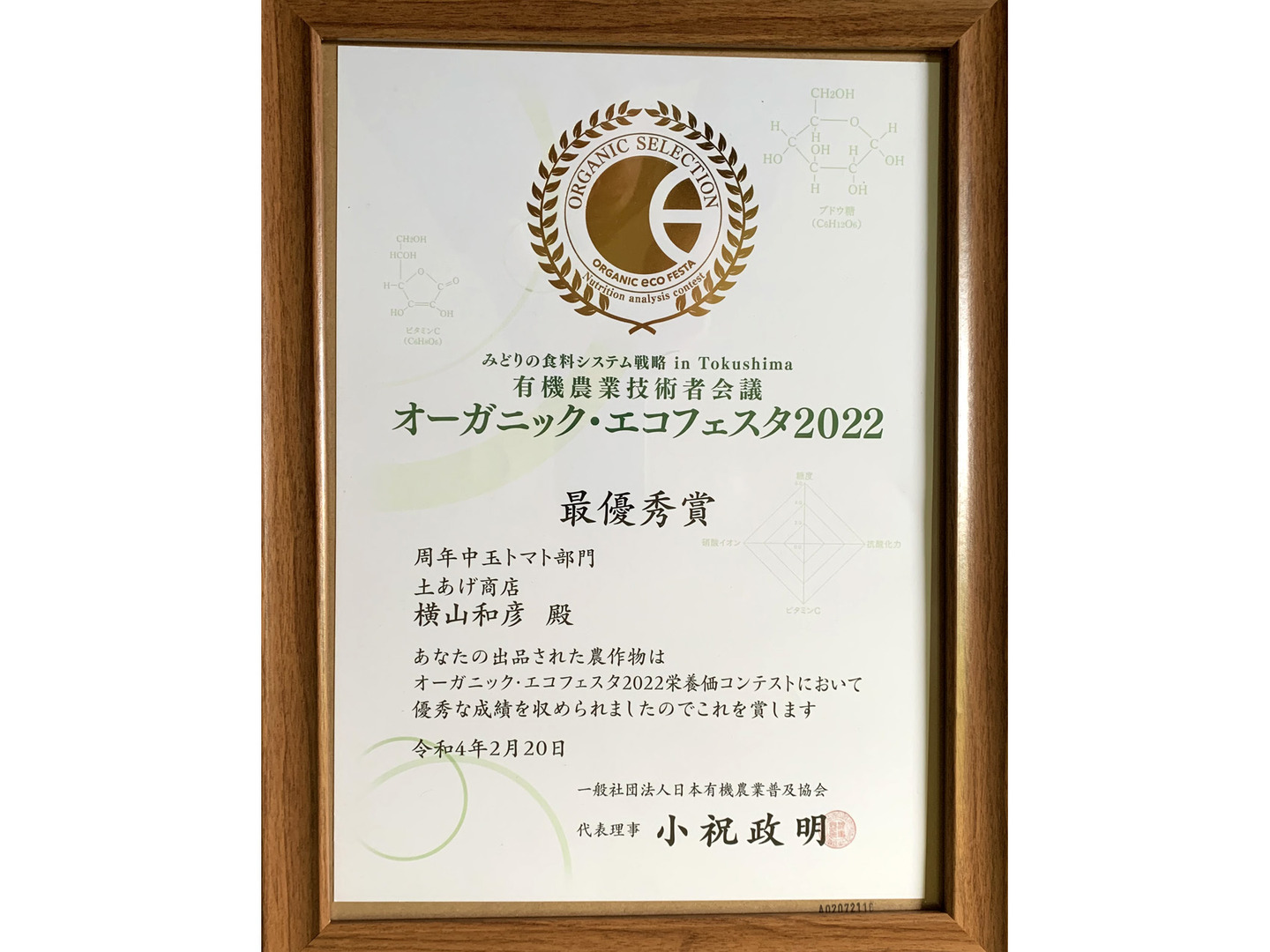※写真6枚目は、一昨年、当社の中玉トマトが受賞した、最優秀賞の賞状です!「糖度」「ビタミンC」「抗酸化力」「硝酸イオン(低いほうが優れている)」「食味審査」の5つの項目で、高評価でした。
