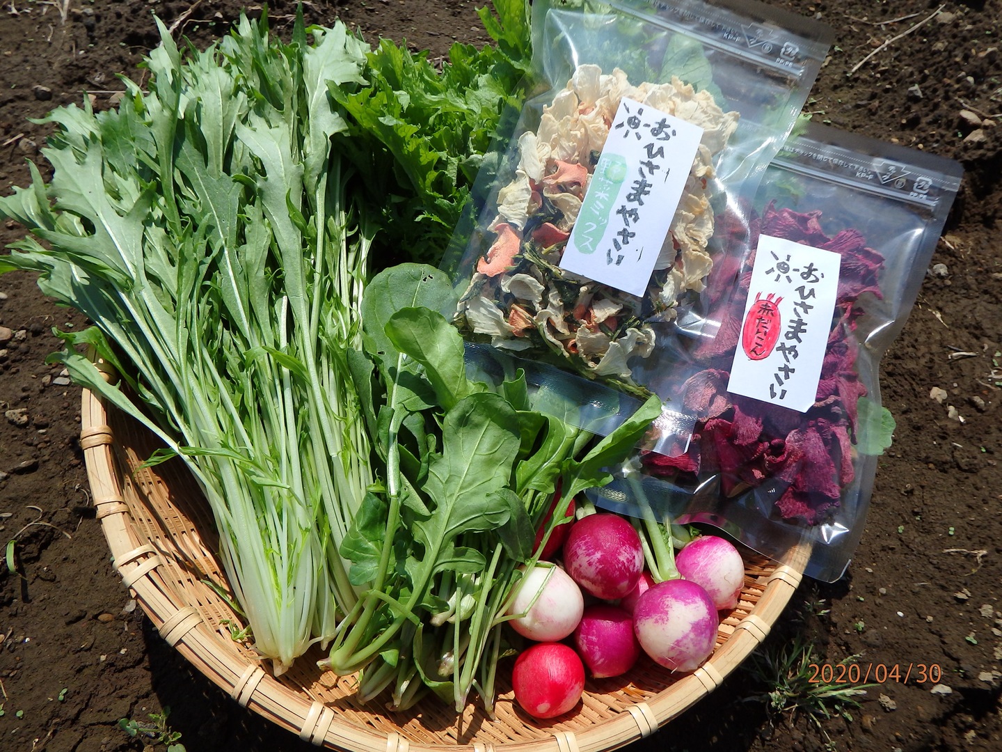 【サラダ野菜4種(ルッコラ、水菜、わさび菜、ラディッシュ)】+ドライベジタブル【おひさまやさい(野菜ミックス&赤だいこん)各25g】