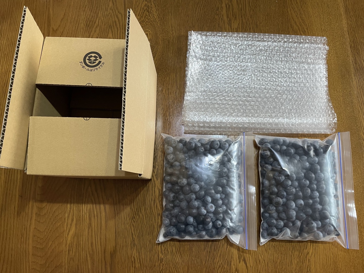 フリーザーバッグにブルーベリーを約550gづつ2袋に分けて袋詰めしています。