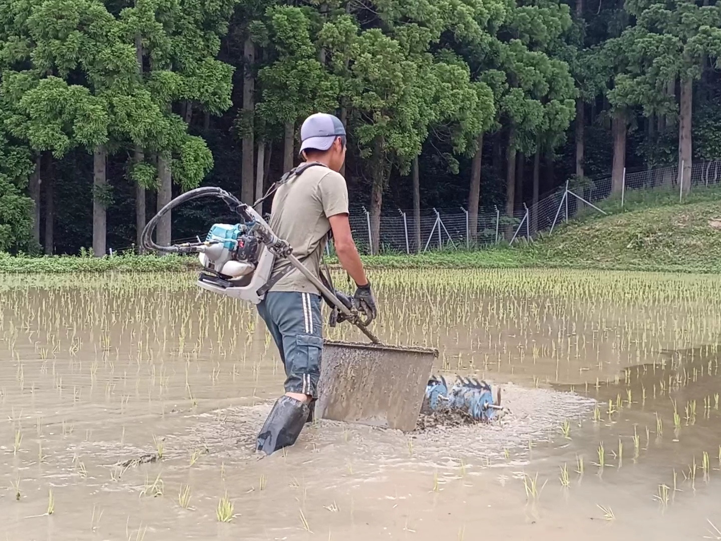 除草機を押して田んぼを歩き回り手作業で除草しています。
