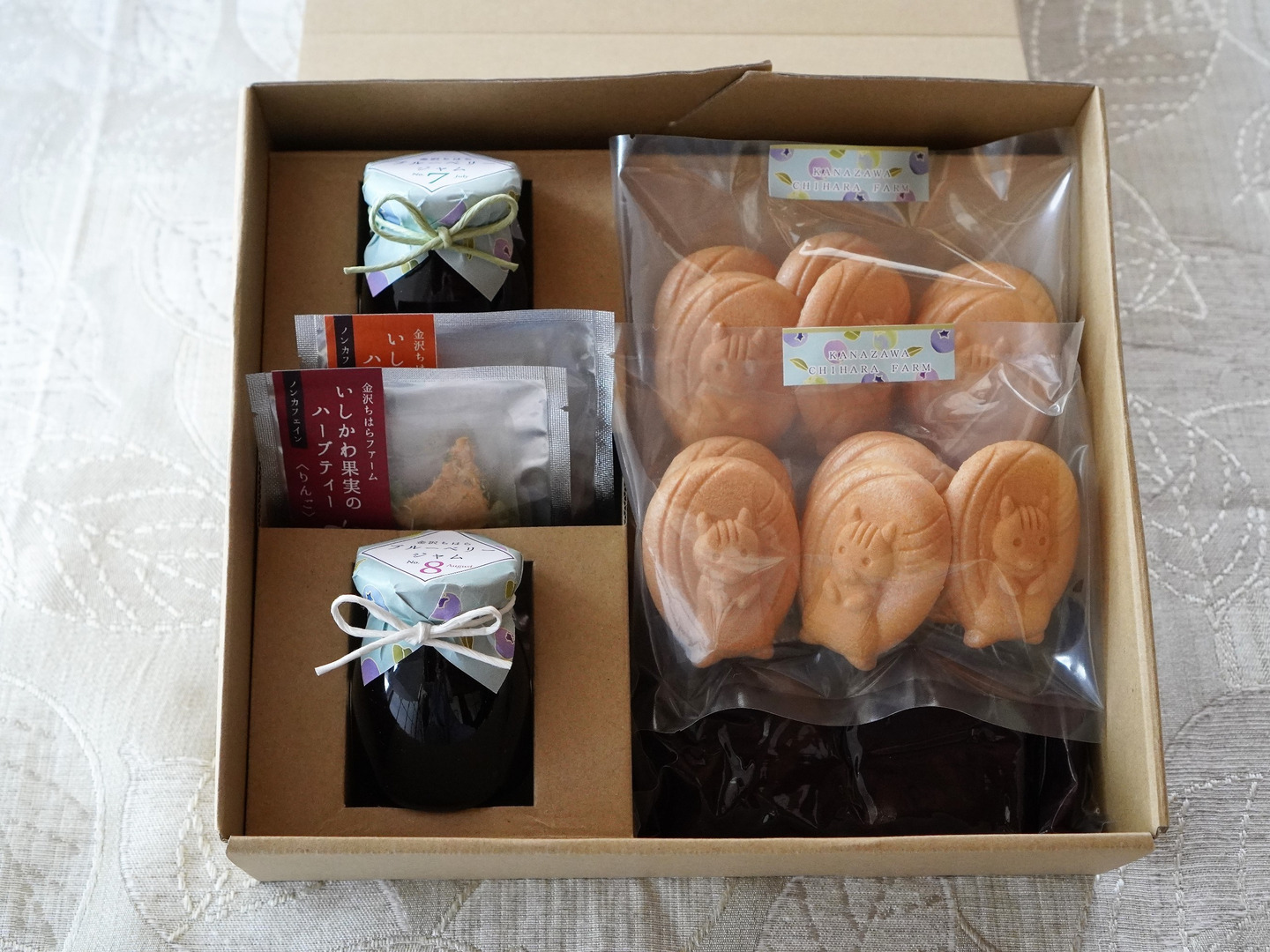 【夏ギフト】【金沢生まれの完熟ブルーベリー】ジャム・手作り最中・ハーブティギフトセットジャム120g×2、あん(袋入り)200g×1、最中(袋入り)3セット×2、ハーブティ(りんご・かき)×各1