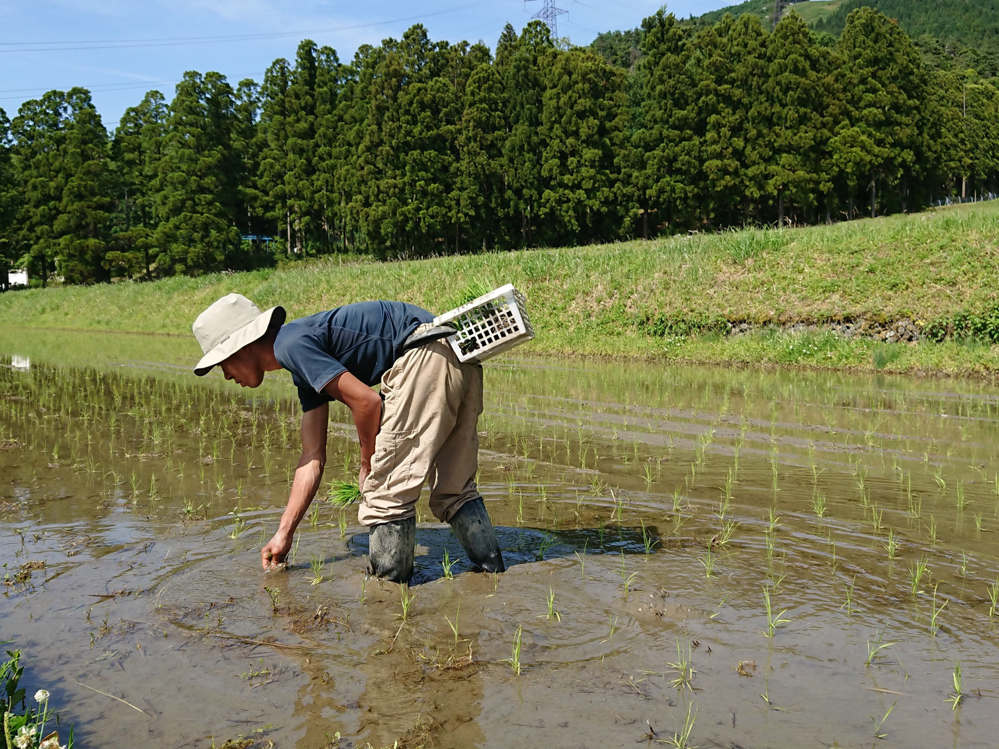 除草機を押して田んぼを歩き回り手作業で除草しています。