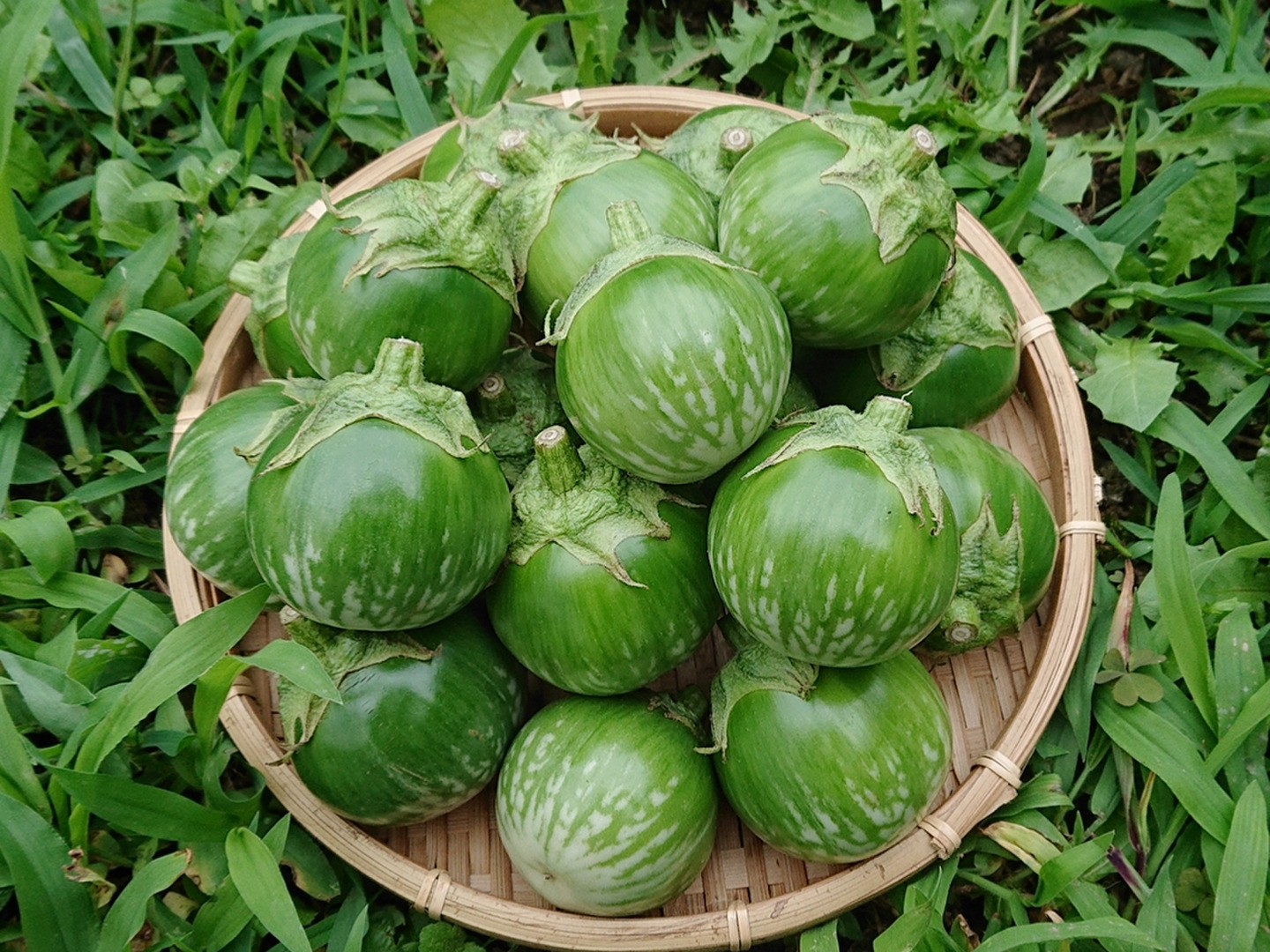 タイカレーなどに使われるナスです。直径4~5cm程の丸い形。皮や身が硬めで種がしっかり入っているのが特徴です。煮崩れしにくいので煮込み料理におすすめです。炒め物や日本のカレーに入れても美味しいですよ♪普通の茄子とは食感などが随分異なり面白い野菜です。グリーンカレーにタイナスを使うと本場感が一気にアップします。